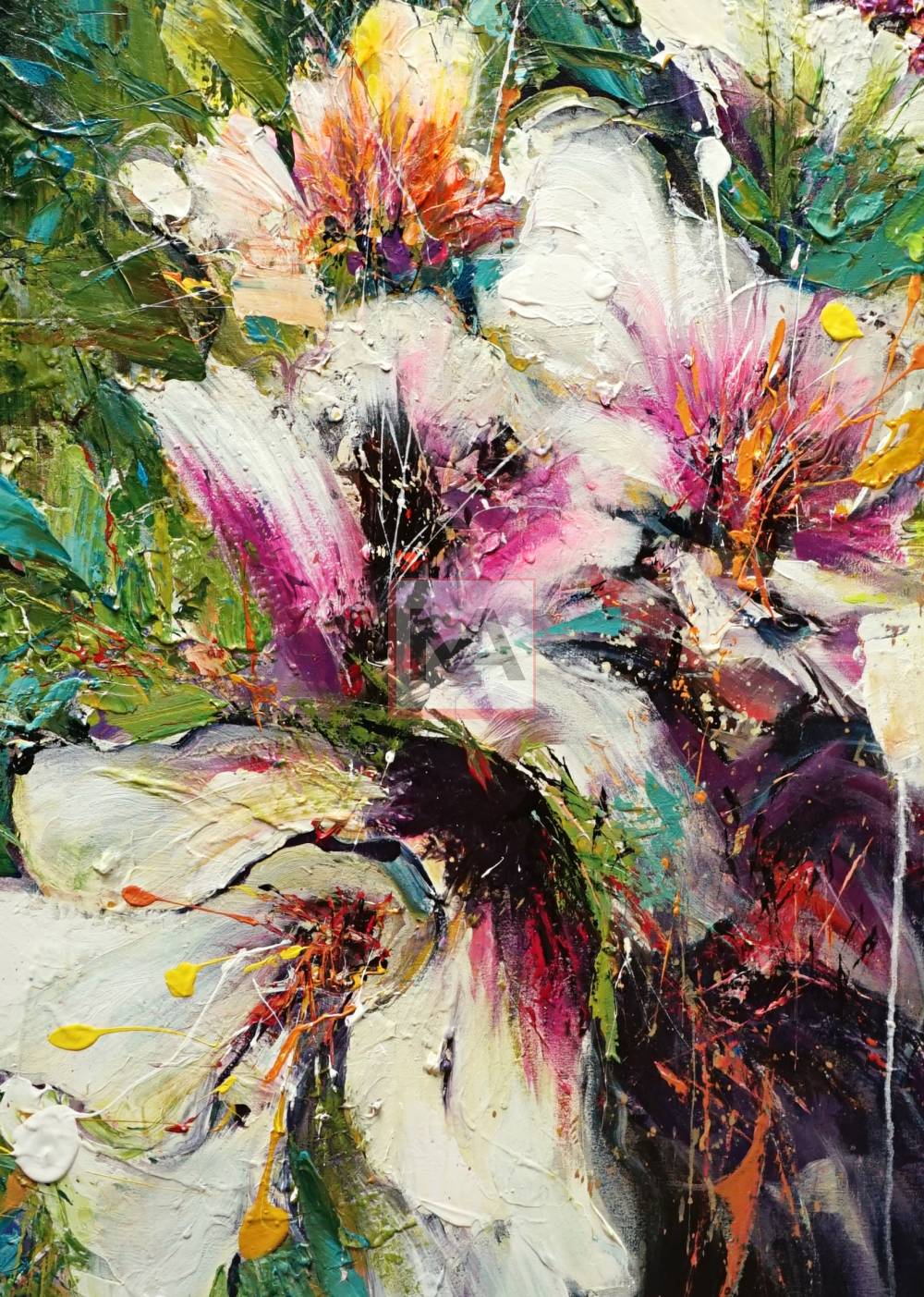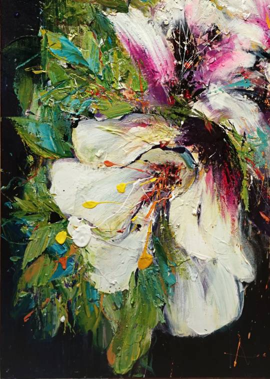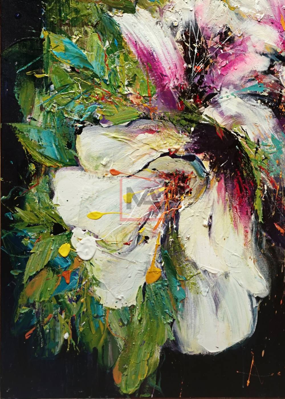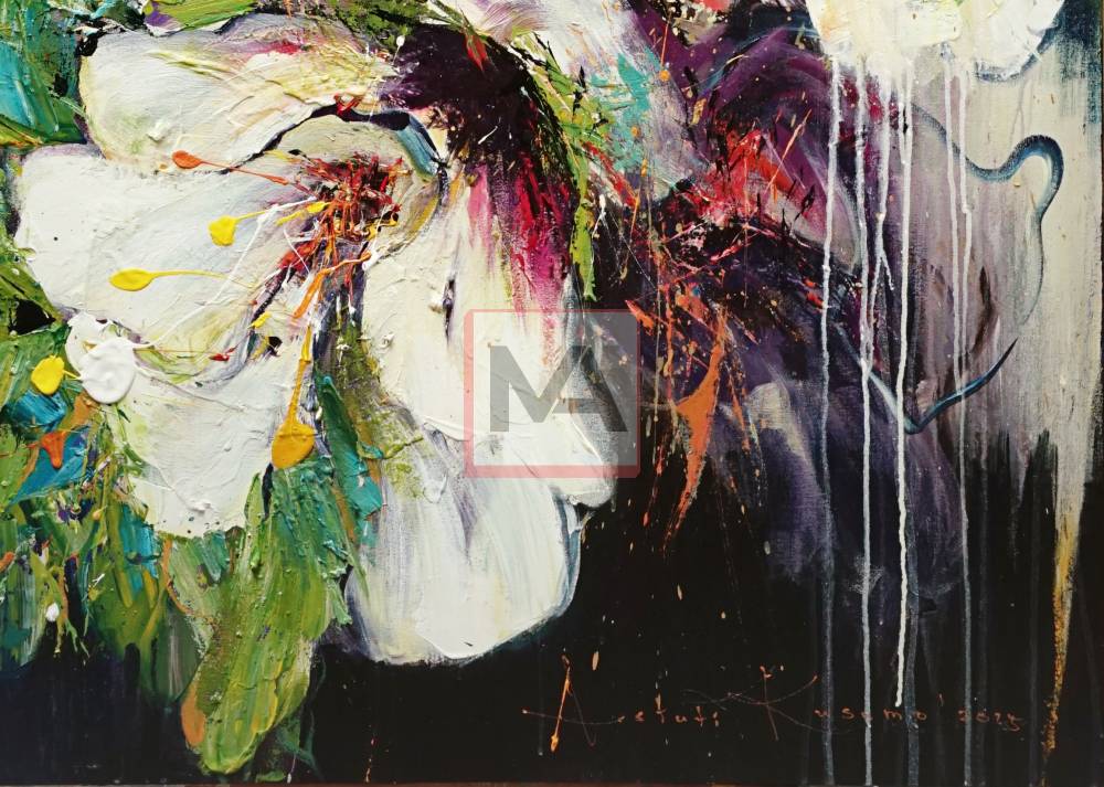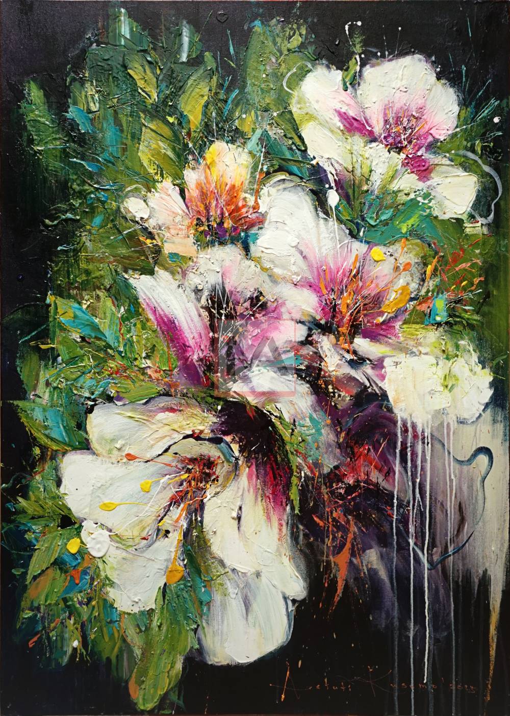 “Emerald Purple” by Astuti Kusumo captures the lush vitality of blooming flowers through expressive, layered brushstrokes and rich contrasts of emerald greens and deep purples. The composition bursts with energy, where thick textures and spontaneous splashes of color evoke both growth and fragility, suggesting a fleeting moment of natural beauty in full bloom. Set against a dark background, the luminous petals emerge dramatically, creating a sense of depth and emotional intensity that reflects the harmony between strength and delicacy in nature.