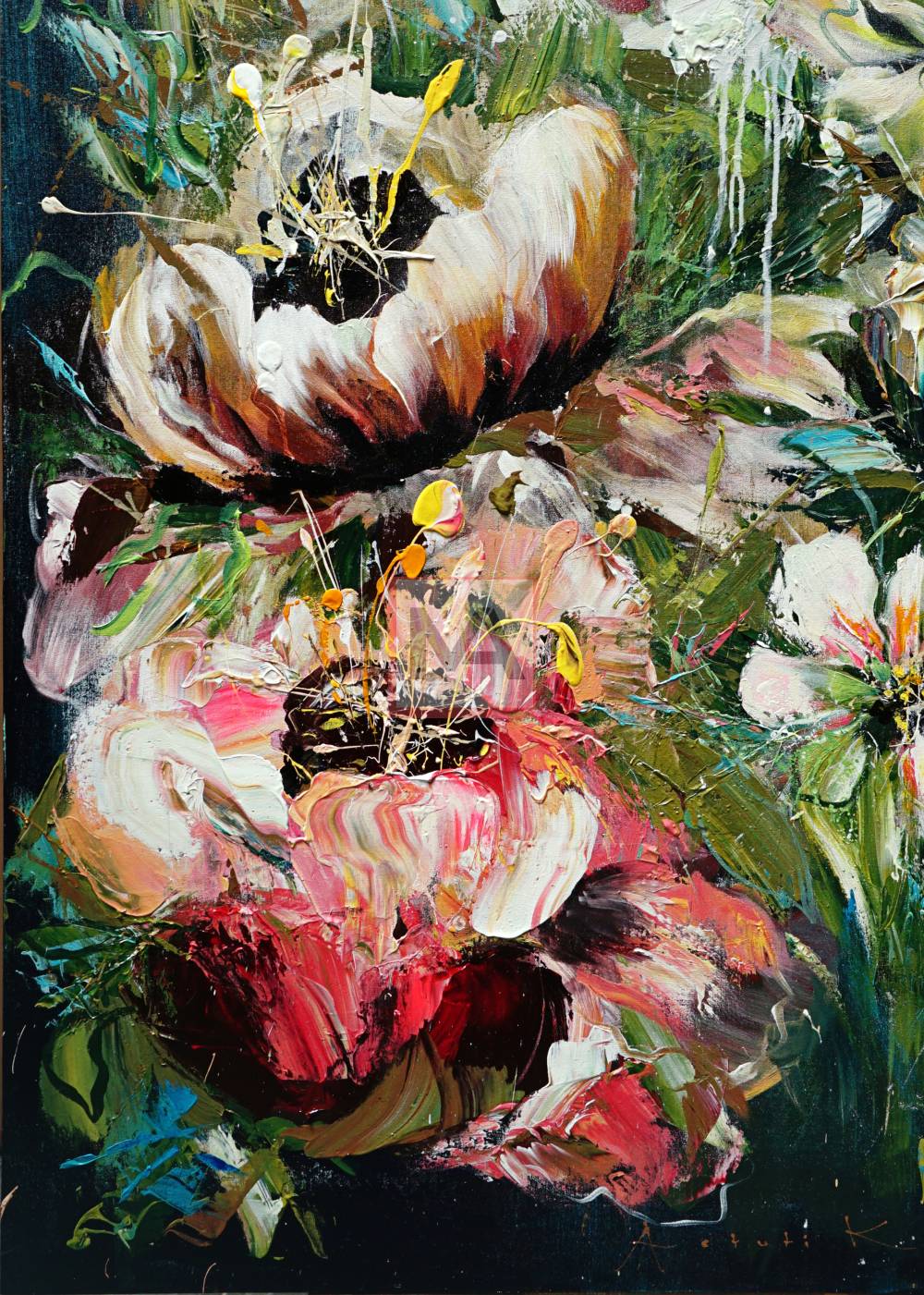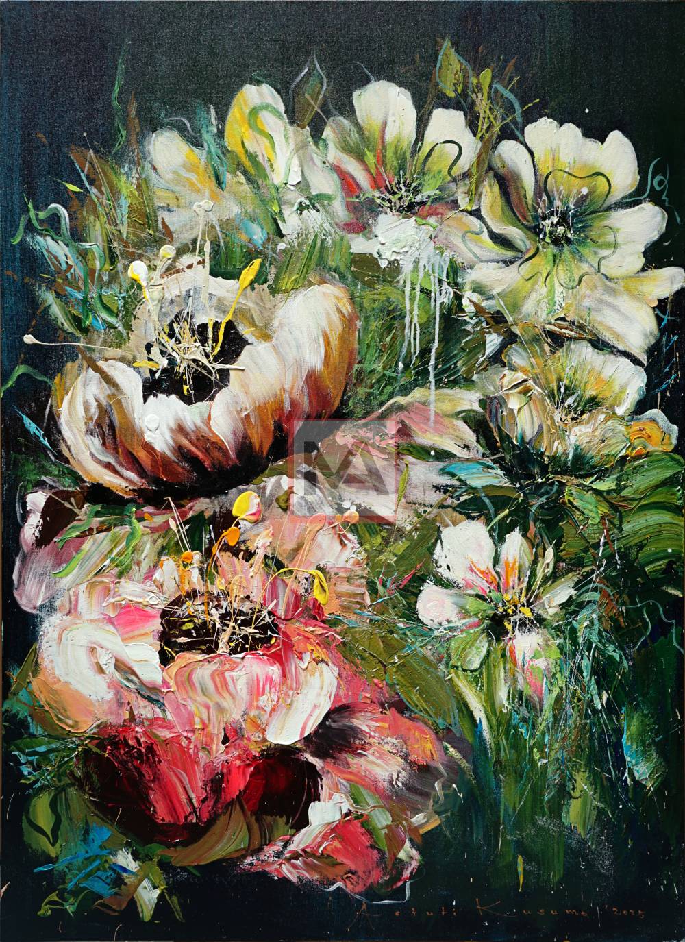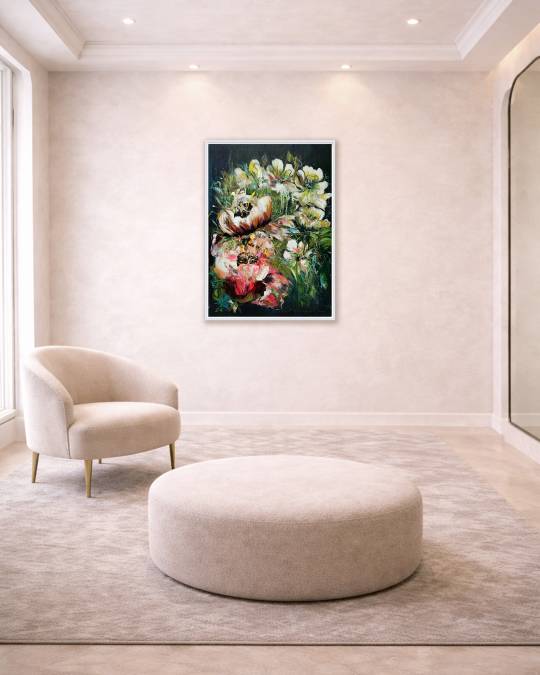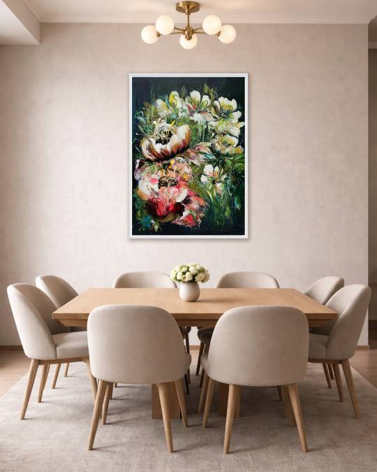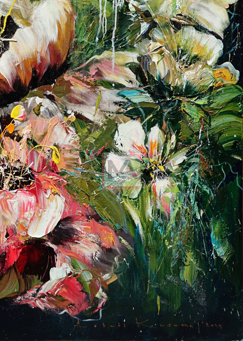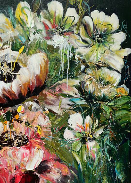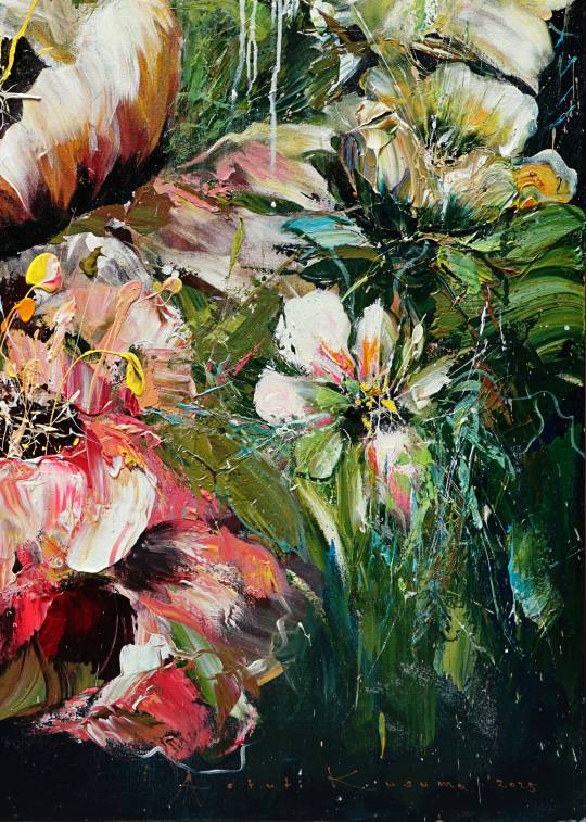 Grace in Power explores the balance between delicacy and strength through Astuti Kusumo’s expressive floral composition. Bold acrylic textures and fluid brushwork create blooms that feel both fragile and powerful.