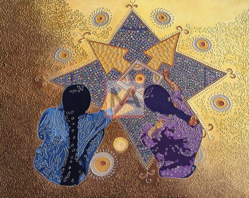 This painting portrays two girls joyfully creating kolams — symbols of prosperity, harmony, and auspicious beginnings. Their synchronized hands reflect unity, balance, and the blending of tradition with innocence. Radiating positivity, the artwork reminds us that true harmony often begins at the doorstep — in our homes, our hearts, and the small rituals of everyday life.