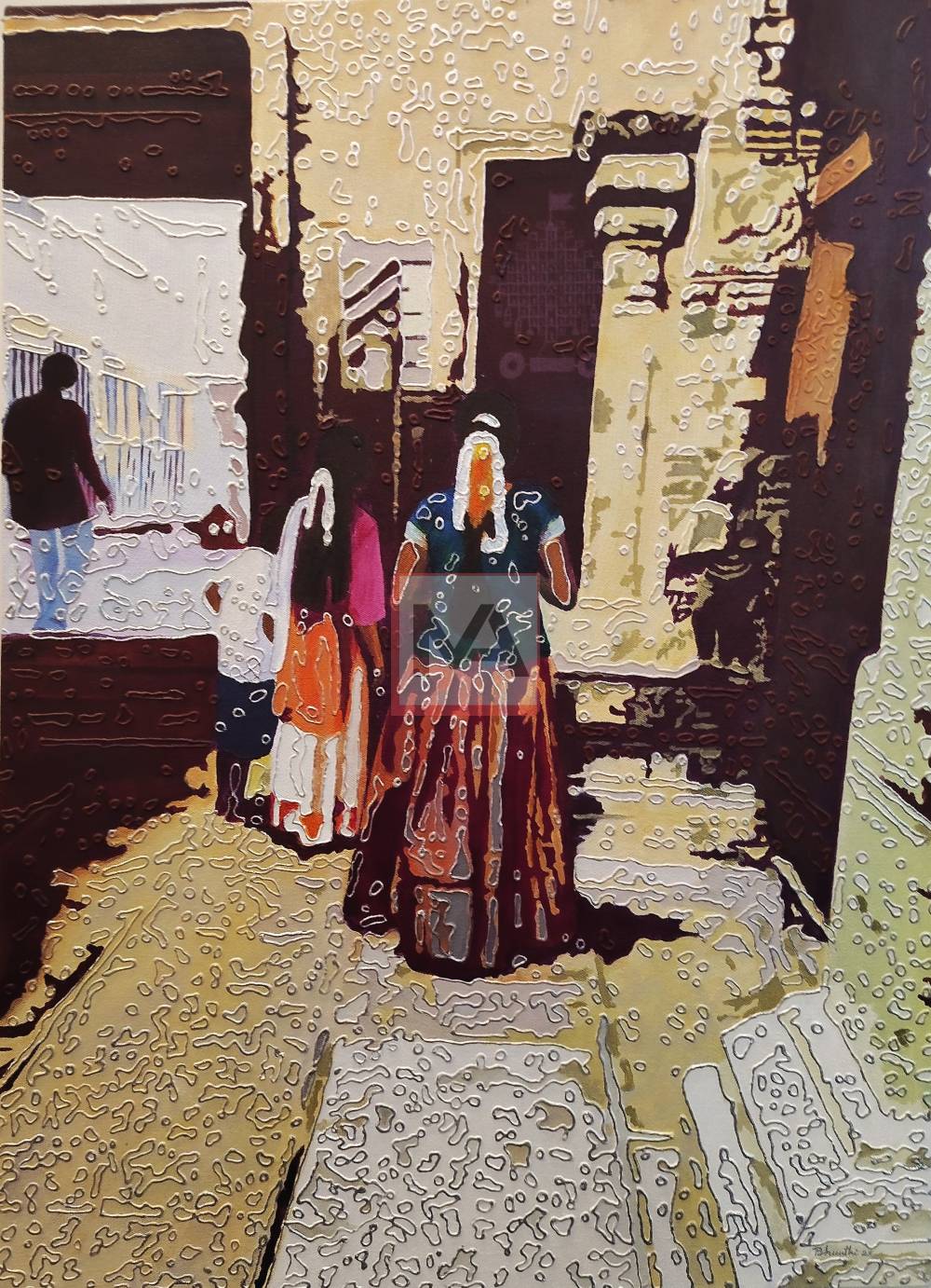 This painting captures the warmth of tradition and the beauty of togetherness as families walk through the sacred corridors of a temple. The vibrant attire, gentle light, and timeless architecture evoke memories of faith, heritage, and shared journeys. It invites the viewer to relive moments of devotion and belonging, creating a deep connection to personal and cultural roots.