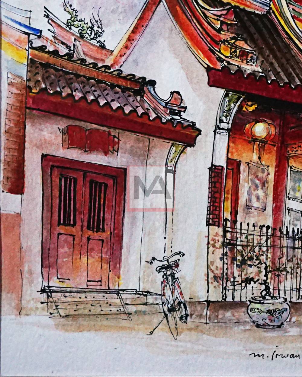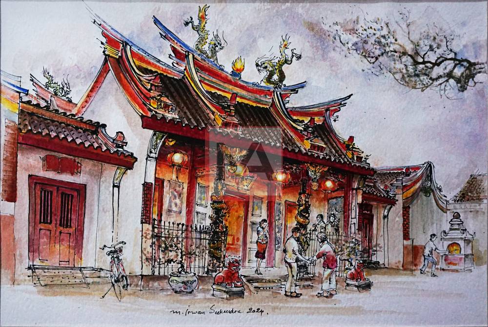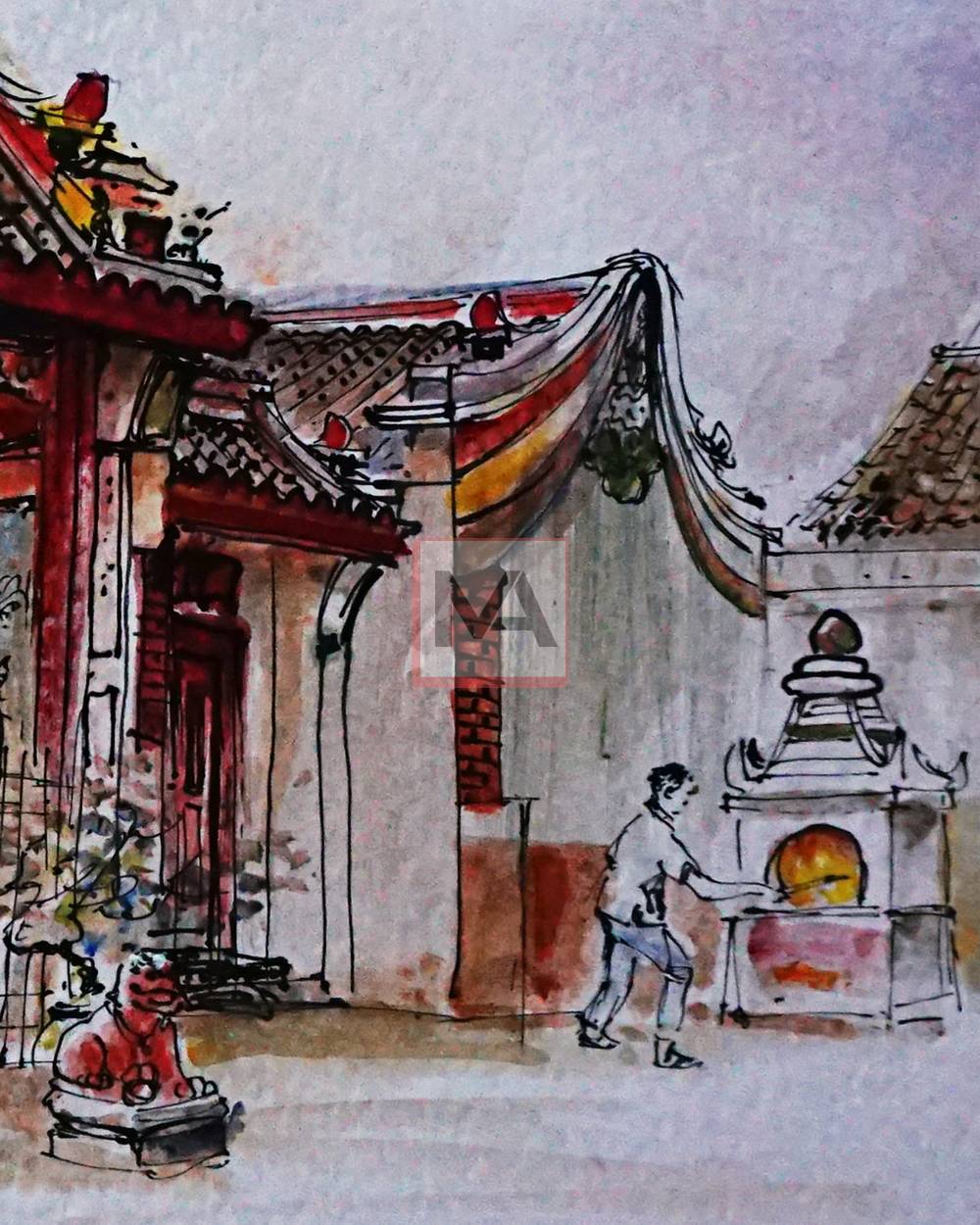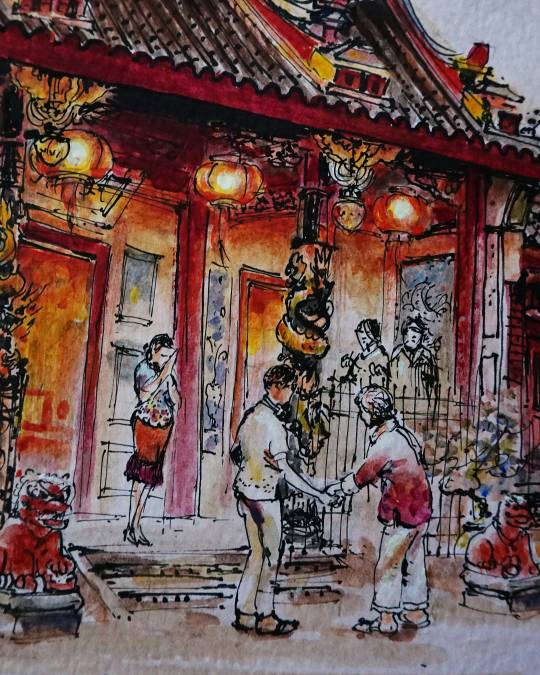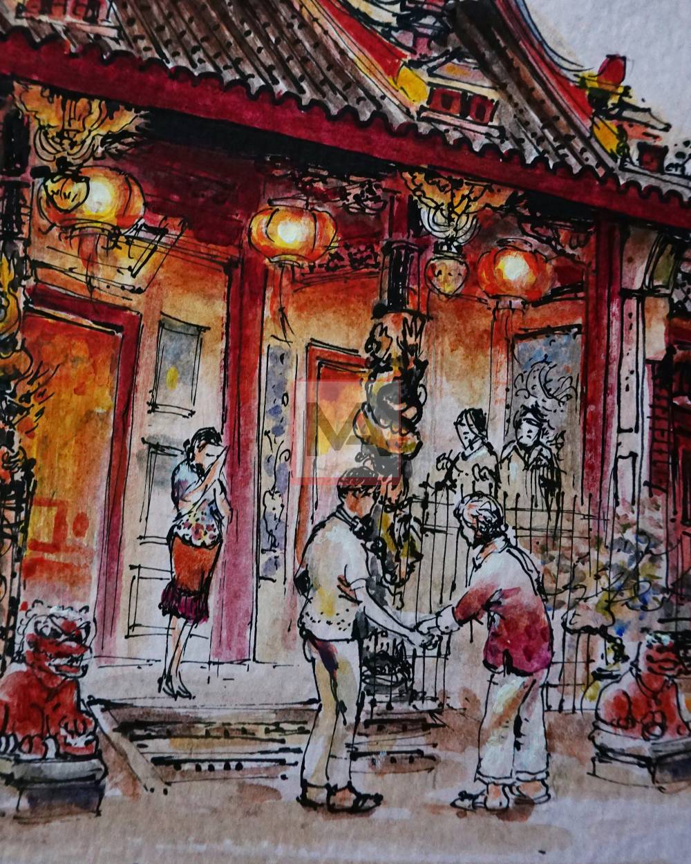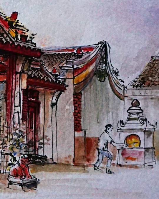 Afternoon with Grandmother captures a tender moment in the courtyard of a traditional Chinese temple. The ornate roof crowned with dragon sculptures, the soft glow of lanterns, and the deep red tones create an atmosphere both sacred and inviting. In the foreground, several figures interact peacefully — among them a grandchild accompanying their grandmother for worship. This intimate scene reflects themes of family bonds, respect for elders, and cultural traditions passed down through generations. The gentle watercolor tones and expressive ink lines evoke a serene late-afternoon ambiance, inviting viewers to experience the quiet spiritual warmth within an ordinary yet deeply meaningful moment.