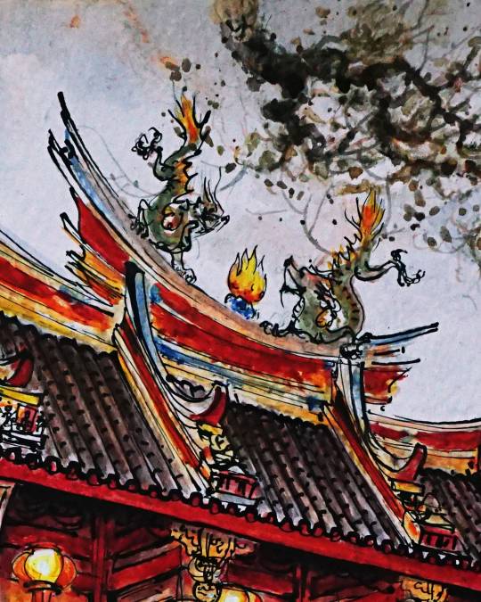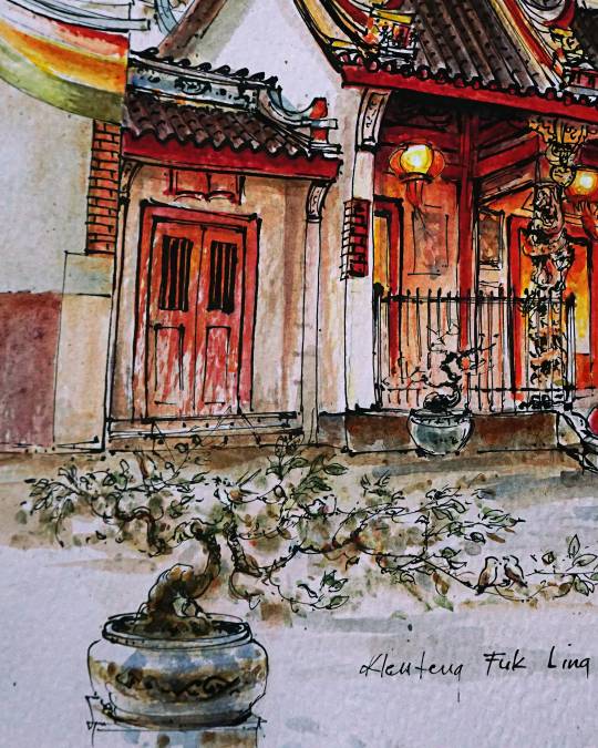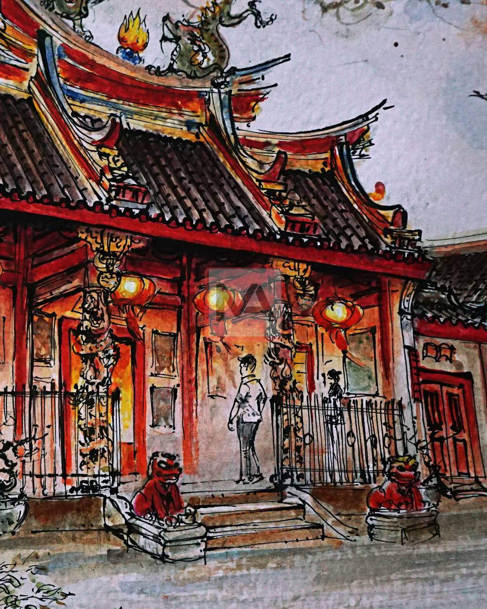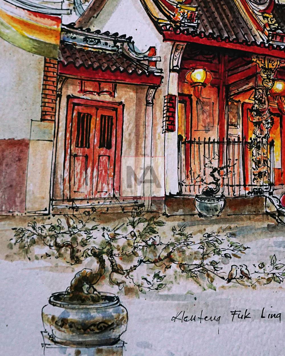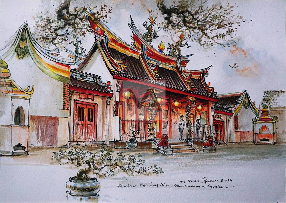 Fuk Li Mau, Gondomanan 2024 portrays the tranquil atmosphere of Klenteng Fuk Ling Miau in Yogyakarta. Warm hues and delicate watercolor lines highlight its traditional Chinese architecture — curved roofs, ornate carvings, and glowing lanterns. The quiet courtyard and a few gentle figures emphasize the temple as both a cultural landmark and an active place of devotion, seamlessly blending heritage with daily life.