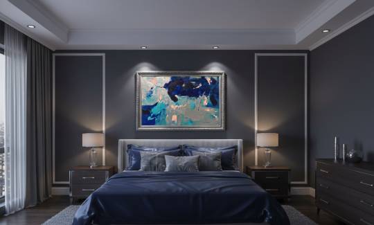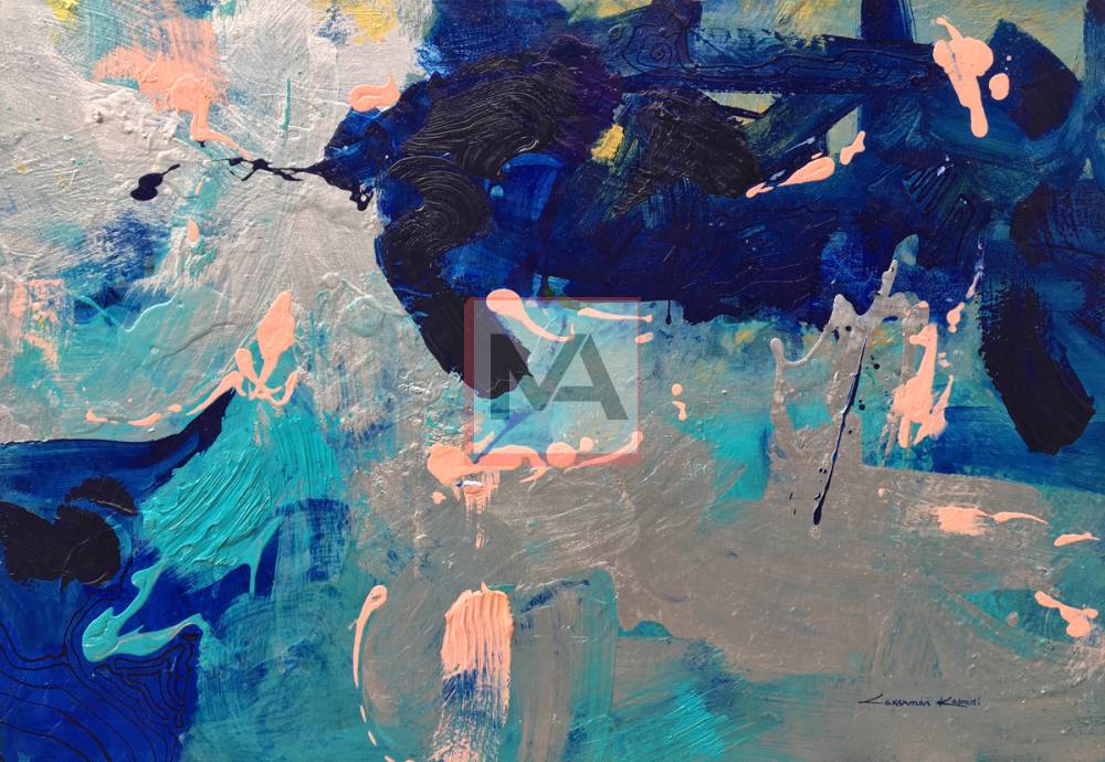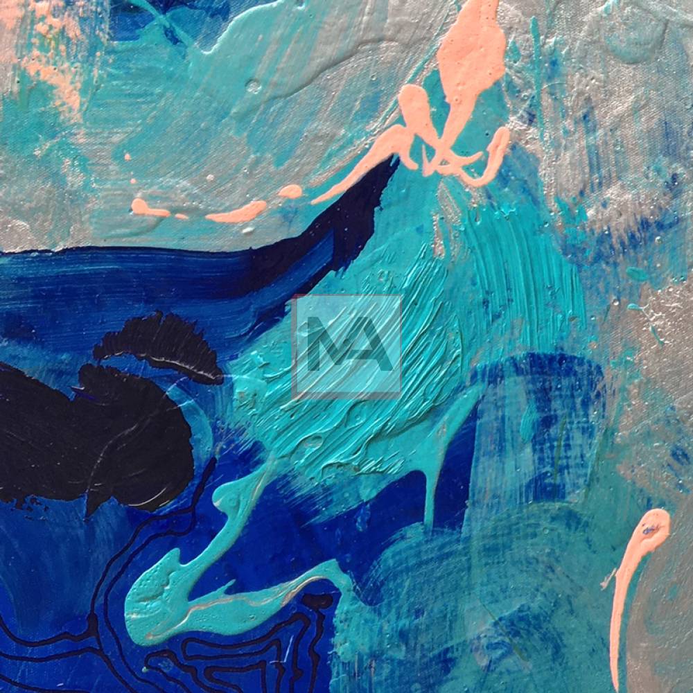 Glacial Drift portrays the silent majesty of shifting ice. Heavy strokes of indigo and cobalt collide like ancient glaciers meeting in a frozen sea. Veins of silver cut through deep blues, echoing sunlight reflecting off jagged floes or minerals trapped in frost. Soft peach accents emerge as unexpected warmth, breaking the cold dominance like a rare Arctic bloom. Layer upon layer suggests a world in graceful transition, drifting steadily toward the unknown. The piece radiates calm yet untamed energy.