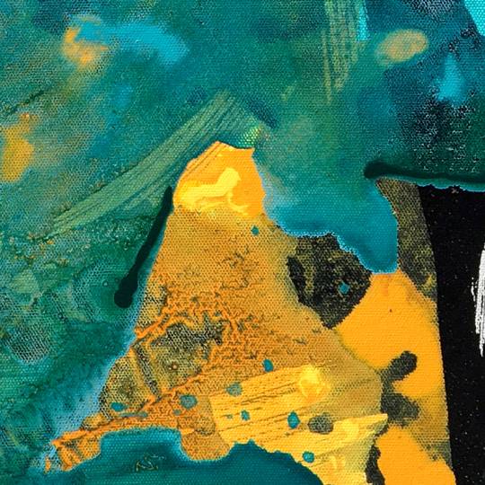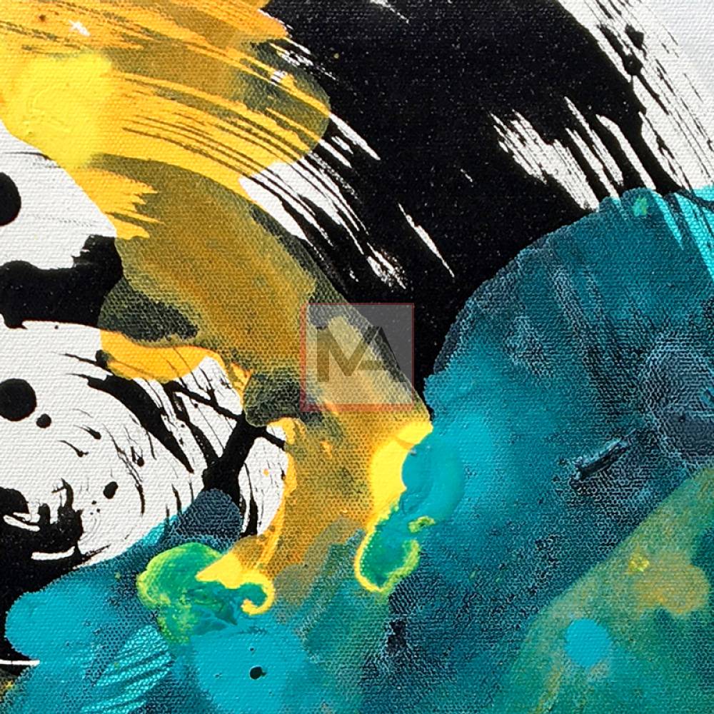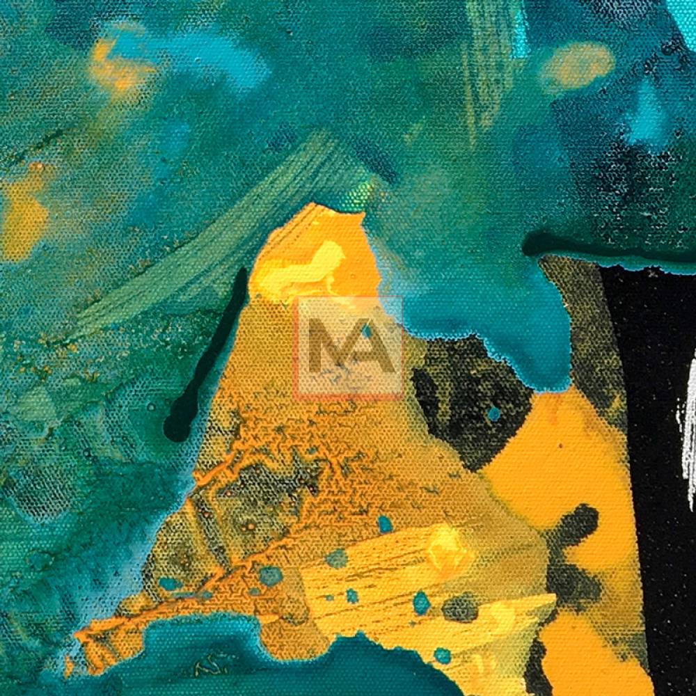 Liquid Echo is a dynamic exploration of fluid energy, where boundaries dissolve into rhythmic flow. Bold splashes crest like sudden waves, meeting deep pools of color that ripple outward with organic grace. The composition captures the precise moment of collision—where dense pigments transform into ethereal washes and delicate droplets scatter like cosmic spray. Striking black accents anchor the movement, sharpening contrast and heightening the weightless sweep of blue arches. Translucent layers reveal hidden depth, suggesting a liquid world where color resonates beyond the surface. Expanses of white space act as a quiet breath, allowing the pigments’ kinetic power to fully unfold. The work captures a fleeting resonance—a motion that refuses stillness.