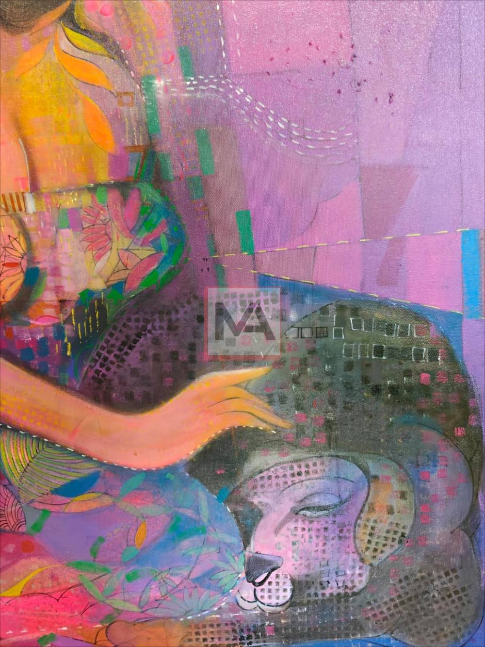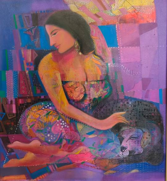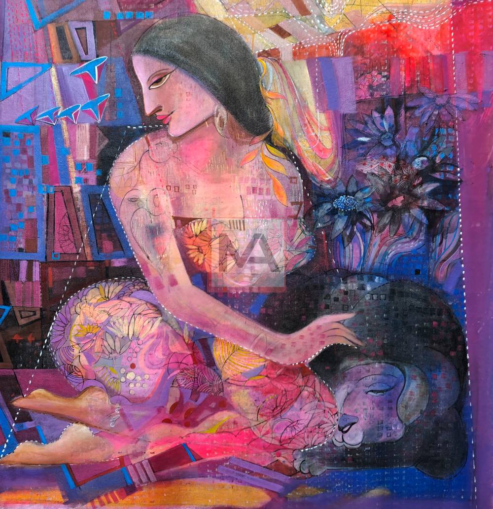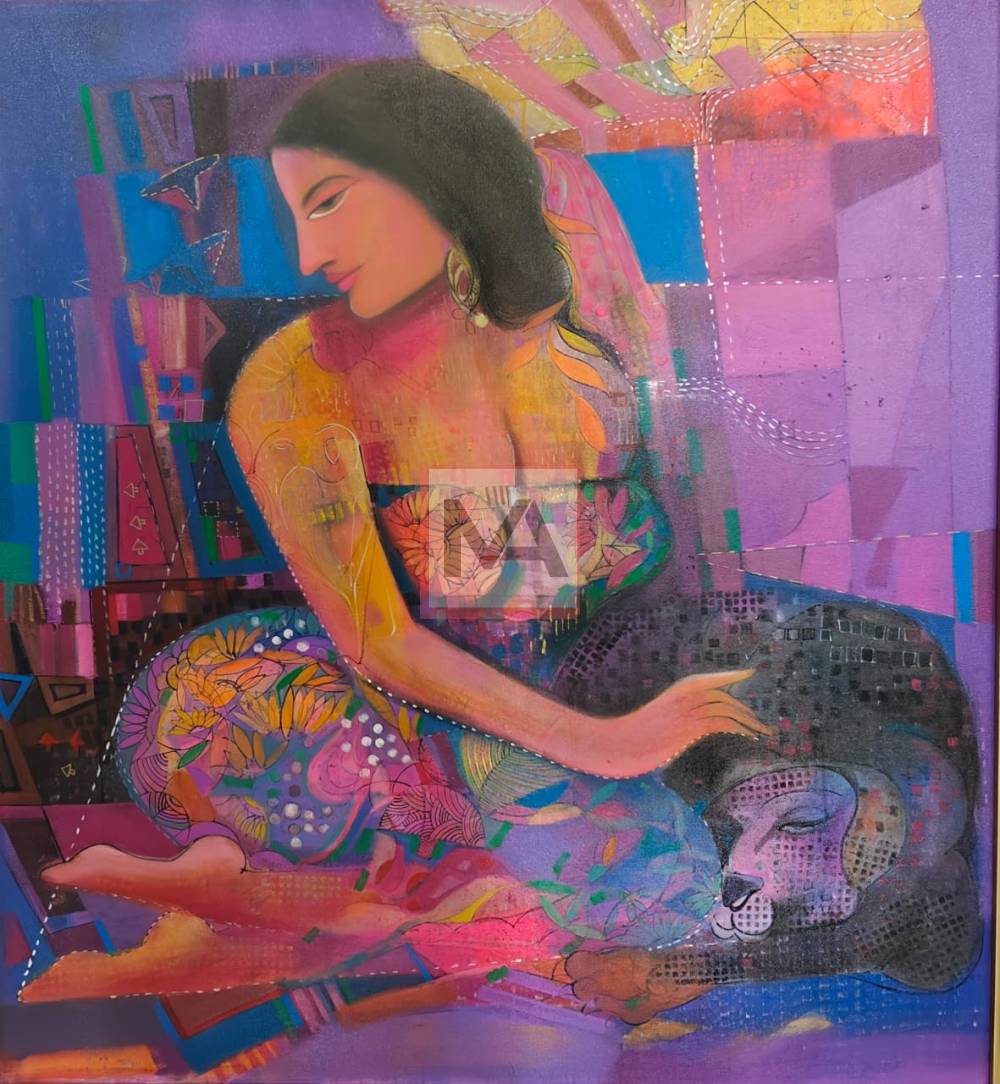In old times man was scared of Divine power and had respect for Him. In the ancient times some of the animals and birds were serving man to protect them particularly in the jungle and other wilder places. Old religious texts have abundance of references. Even the Gods and Goddesses used them as vahanas. In ancient times homeless people were keeping the dogs on night vigil. In old Punjab the villagers were not in favor of the rope around the neck. These were not branded dogs but ordinary street type dogs. These dogs were either used to sit on the door or allowed to sit in the area of the kitchen but in limit. There were one or two houses of the rich people who were having big dogs just to show their richness or scared people with power. It was believed that black dog represent divine power and was offered roti with mustered oil. Similarly parrot, the vahana of Kama ,was captured in the cage either by the women to chat or by the goldsmith as informer. In the present time man is lonely and living in the arena of superficial desires. There is no family bonding. Human beings are in race which never ends. Earlier man was not alone but the joint family was there to sort out all the problems of life. The entire village was a family and celebrate life. There was no word of fear and secrecy. Now feeling in loneliness is common. People used to sit together in sath to share the feelings. Now in present time man decorate the house with the plants in the pot. Mostly he buys the plastic flowers without any fragrance. In the past man was in love with the trees and worship them . These trees and herbs were helpful in curing the diseases. In this time trees and plants are devoid of fragrance and no bird sit on them. Man is working like a machine without any emotions. Madan ,the prolific artist, always working on such subjects to create awareness for the welfare of the society. He is expert in dissection of mind, body and soul. His damsel, the most beautiful with all the ideals of Indian beauty summarizes the definition of Shingar. Her long black hair are adorned with tendril and ears wear leaf like ornaments. Her profile face with sharp feathers are hiding the reality inside though the outer is just a cover of decoration and illusion. One of her hand is placed on the head of the pet. Both release oxytocin and correlate the social bond. She has deep reverence for the pet. She is in melancholy but trying to cope with stress. The pet near by is capable of assessing humans emotional states. Madan painted therapy of the present time. Parrots in various poses and postures on the arm show the desires which she carry along. Her body is adorned with numerous flora and fauna which enhance her beauty. These are rare metaphors which carry deep meaning. The interesting is the close bond allowing each others body language. Madan is a psychologist Her beautiful damsel suffers from isolation, inside depression and mental illness finds security in an emotional support animal. It looks therapy pet is throwing light on her loneliness. It an important determinant for psychological well being. The pet gives a sense of cohesion to a person’s sense of self.