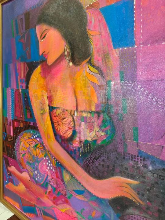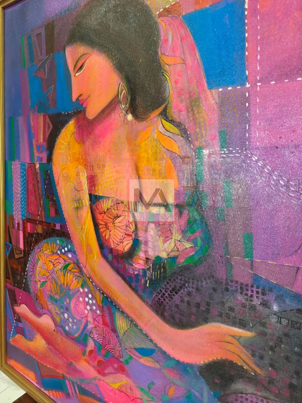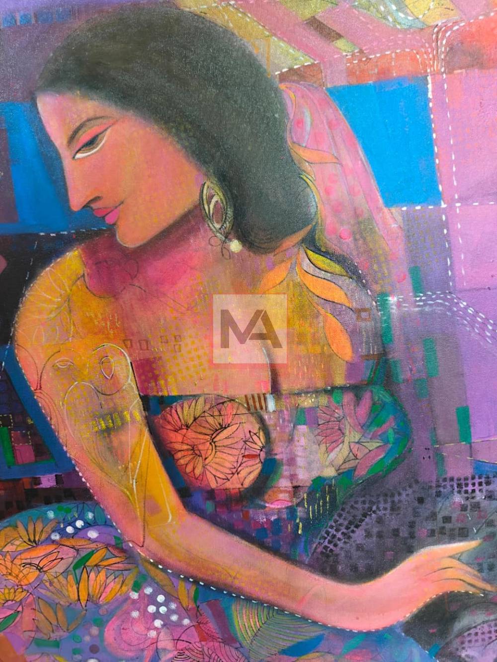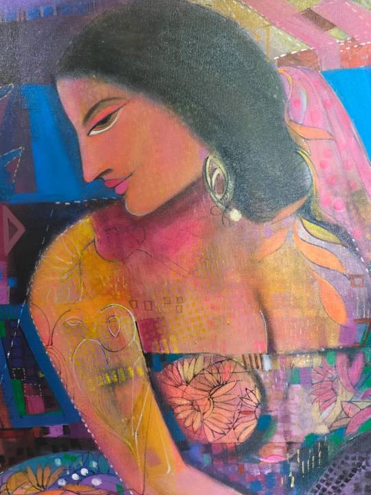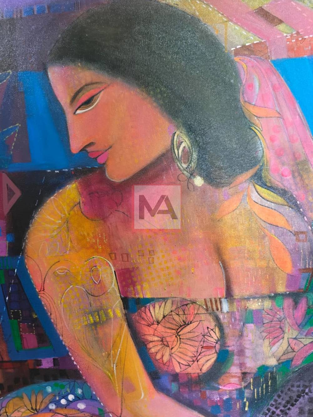 In old times man was scared of Divine power and had respect for Him. In the ancient times some of the animals and birds were serving man to protect them particularly in the jungle and other wilder places. Old religious texts have abundance of references. Even the Gods and Goddesses used them as vahanas. In ancient times homeless people were keeping the dogs on night vigil. In old Punjab the villagers were not in favor of the rope around the neck. These were not branded dogs but ordinary street type dogs. These dogs were either used to sit on the door or allowed to sit in the area of the kitchen but in limit. There were one or two houses of the rich people who were having big dogs just to show their richness or scared people with power. It was believed that black dog represent divine power and was offered roti with mustered oil. Similarly parrot, the vahana of Kama ,was captured in the cage either by the women to chat or by the goldsmith as informer. In the present time man is lonely and living in the arena of superficial desires. There is no family bonding. Human beings are in race which never ends. Earlier man was not alone but the joint family was there to sort out all the problems of life. The entire village was a family and celebrate life. There was no word of fear and secrecy. Now feeling in loneliness is common. People used to sit together in sath to share the feelings. Now in present time man decorate the house with the plants in the pot. Mostly he buys the plastic flowers without any fragrance. In the past man was in love with the trees and worship them . These trees and herbs were helpful in curing the diseases. In this time trees and plants are devoid of fragrance and no bird sit on them. Man is working like a machine without any emotions. Madan ,the prolific artist, always working on such subjects to create awareness for the welfare of the society. He is expert in dissection of mind, body and soul. His damsel, the most beautiful with all the ideals of Indian beauty summarizes the definition of Shingar. Her long black hair are adorned with tendril and ears wear leaf like ornaments. Her profile face with sharp feathers are hiding the reality inside though the outer is just a cover of decoration and illusion. One of her hand is placed on the head of the pet. Both release oxytocin and correlate the social bond. She has deep reverence for the pet. She is in melancholy but trying to cope with stress. The pet near by is capable of assessing humans emotional states. Madan painted therapy of the present time. Parrots in various poses and postures on the arm show the desires which she carry along. Her body is adorned with numerous flora and fauna which enhance her beauty. These are rare metaphors which carry deep meaning. The interesting is the close bond allowing each others body language. Madan is a psychologist Her beautiful damsel suffers from isolation, inside depression and mental illness finds security in an emotional support animal. It looks therapy pet is throwing light on her loneliness. It an important determinant for psychological well being. The pet gives a sense of cohesion to a person’s sense of self.