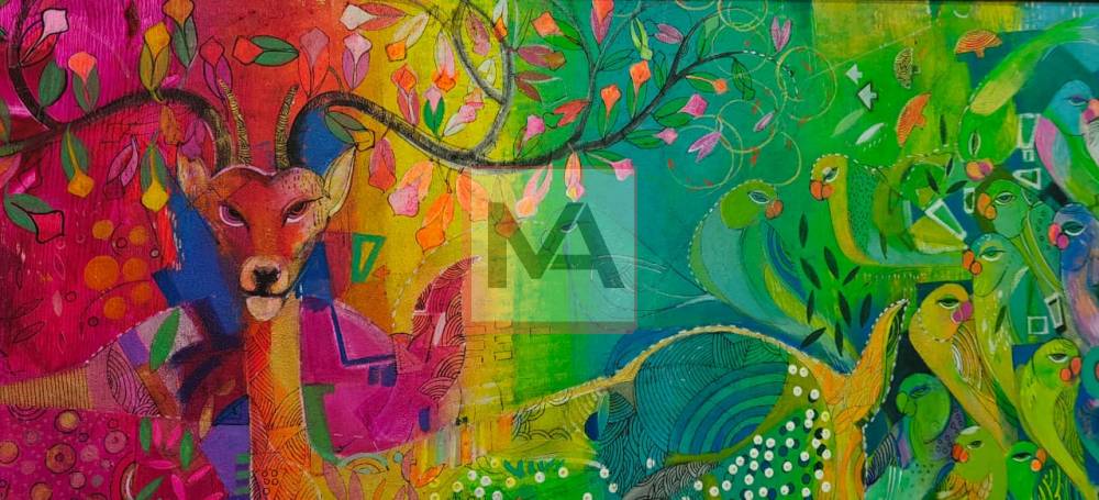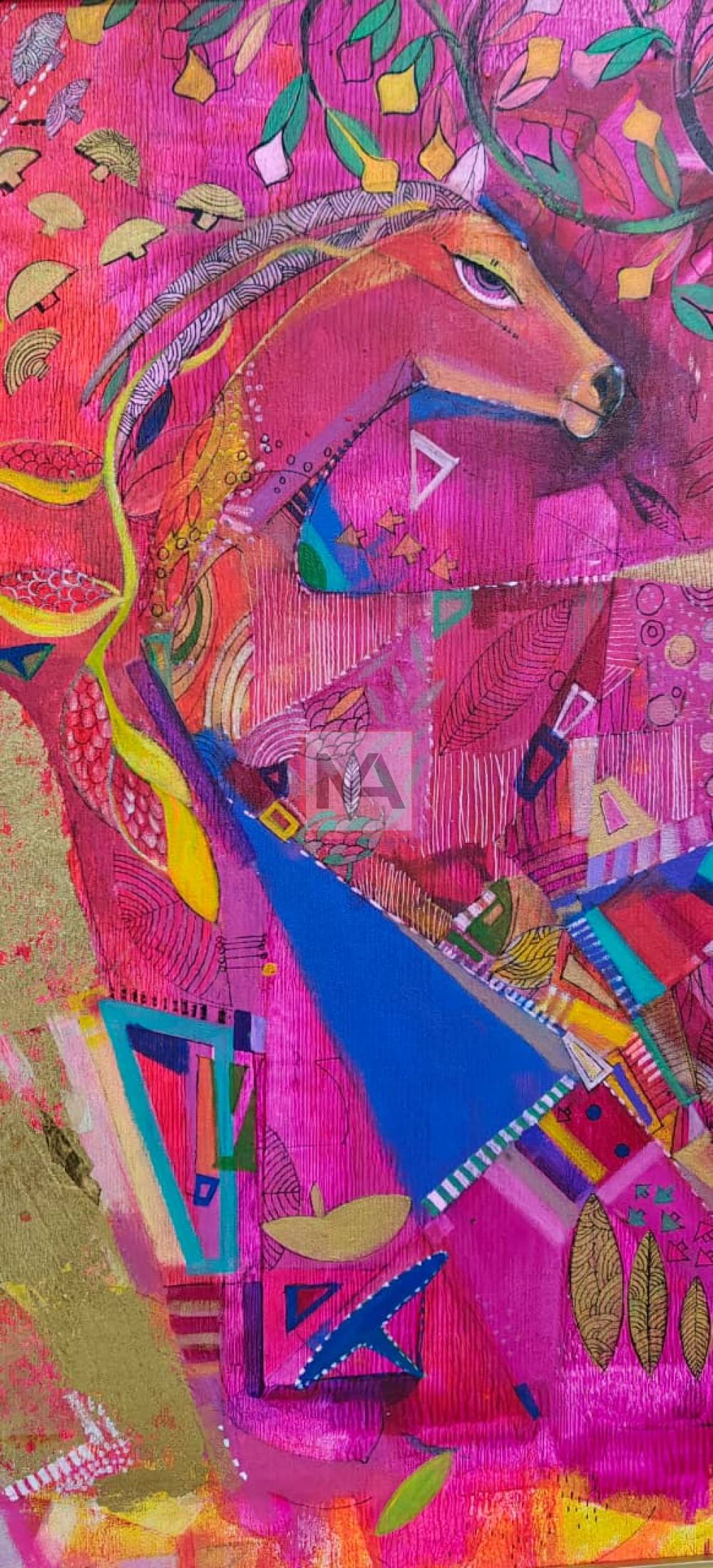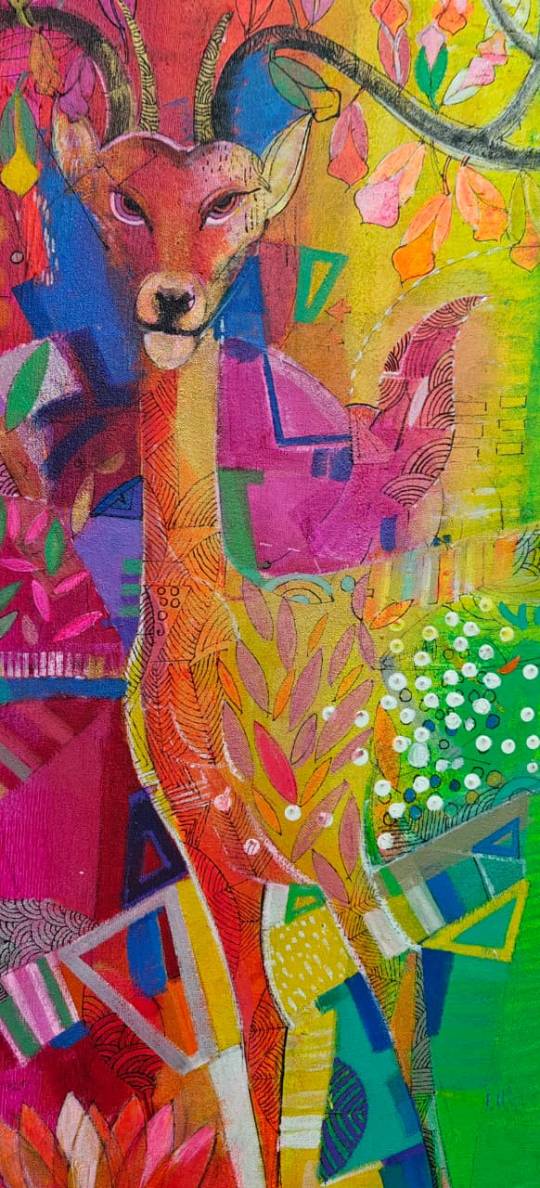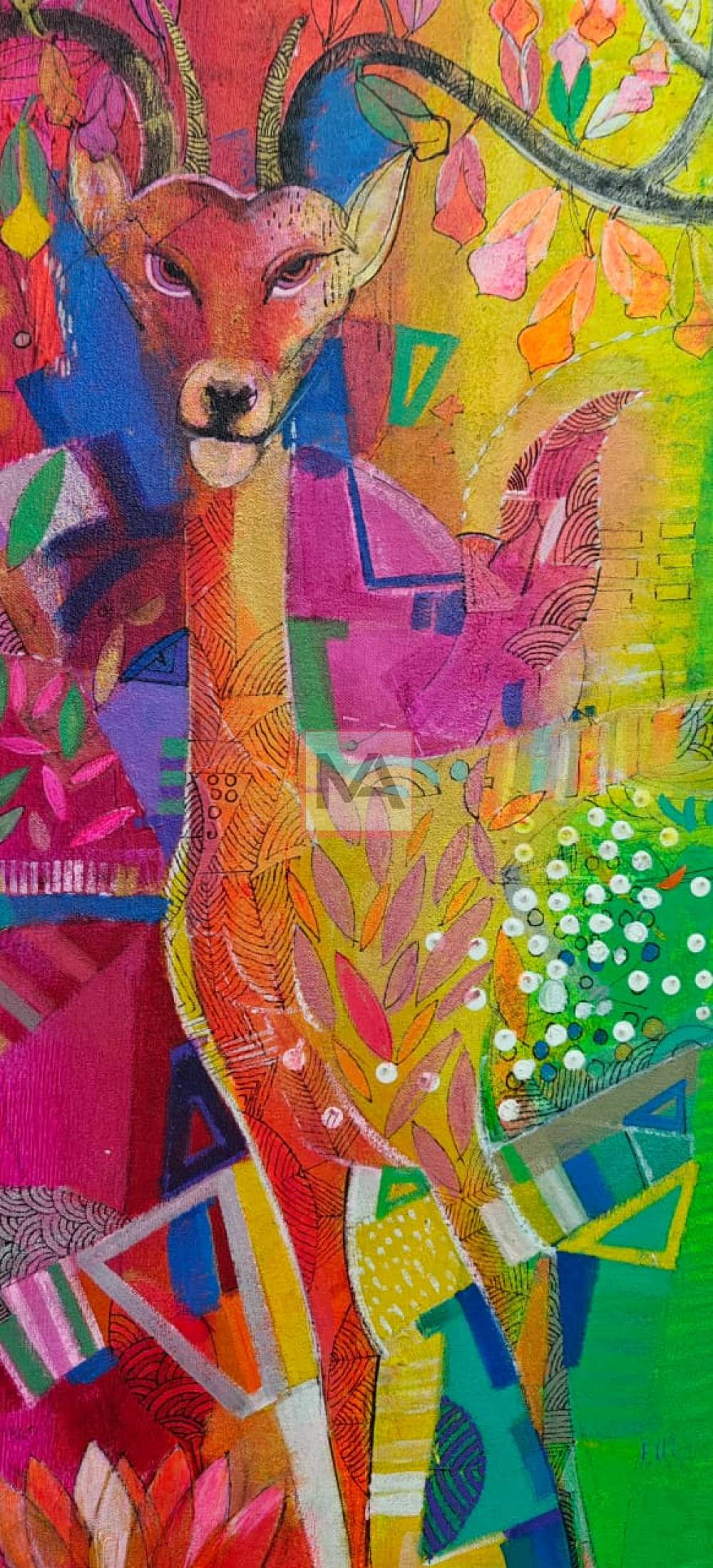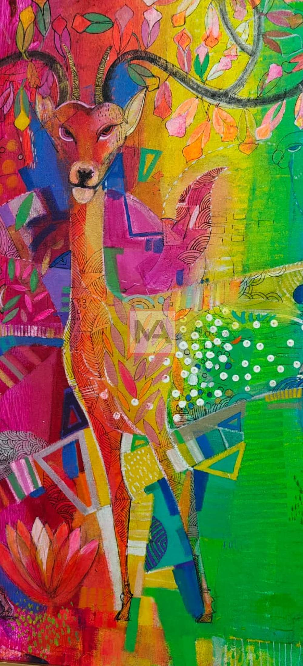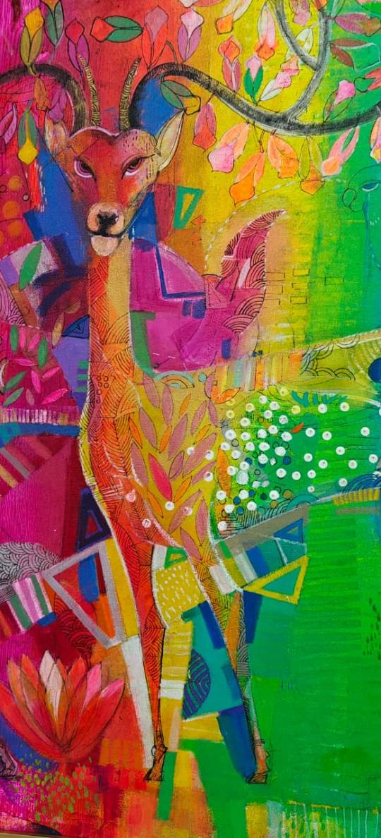 God blessed man with the three layers of mind. When these become in balance and knotted each other then man enters in the enlightened Space.There is no scope for interpretation and charcha only the flow of nectar can be tasted. One loose ones own existence rather become its supplement and segment. In this ocean of nectar man knows himself then he knows the Ek. After seeing the Deer with Kasturi of MadanI could not sleep and the image appeared time and again in my mind . Its first stable look was like a magic ‘Akath Katha' and came like a thunderstorm. Its firm neck is a text of the Vedas which are make -believe that the anxiety of mind is removed by reading., if you fix your mind even for a moment, the self existent Goodwill be in front of you.’ Why the Deer with Kasturi has stuffed his body with flowers and leaves so many other elements from nature. Why its body is enlightened in golden colour. Deer is so alert that his ears can listen from fatal to heaven perhaps the artist is well versed in the concept of Dhavani. Deer says the leaves in his body are the representative of Brahma, Vishnu is in branches and Shiva is in flowers which dominates the head of the Deer. What is this Golden light? Is it an illusion? How am I blessed with kasturi? . Not easy to understand with blind eyes. This is the oil of Truth and the wick of God. Deer admits that he has made his own lamp to enlighten the own body. The enlightened alone can realize it. It is not an illusion rather Truth. Kasturi is the treasure of Fragrance, perhaps preferring to live in the jungle of the Chandan tree. Deer accept his preference for chandan wood tree though its height is small and surrounded by useless trees but its nearness is provider of Fragrance to all the flora and fauna around. Why does he not like to dwell in Bamboo jungle.? It is full of ego because of its height. Even if close to Sandalwood, the Bamboo tree does not become fragrant. Deer with Kasturi do not feel safe near the bamboo jungle as hunters may discover him easily but hardly come close to sandalwood due to snakes. Madan’s Deer is not just a piece of decoration or narrating any epic. His Kasturi Deer is sublime and a discovery of the Self. His image is simple but a panorama of the unlimited divine spirit. It is an unuttered prayer of the Universe.