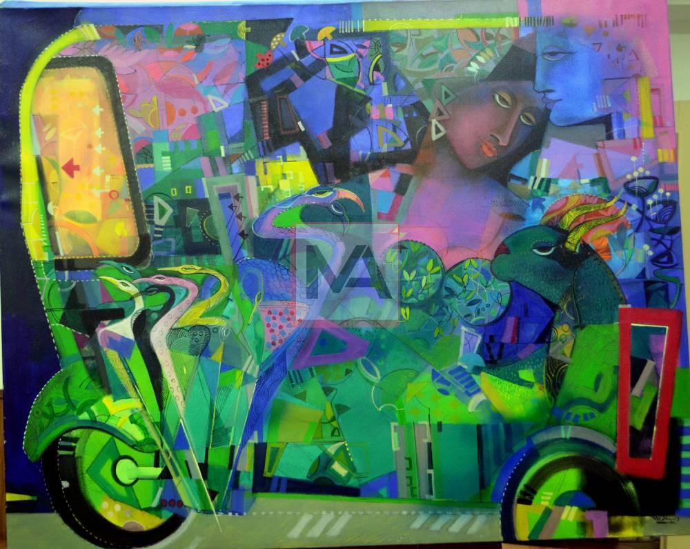 A work of art is a complete text of its own written by the creative person without any idea of fanaticism. Their main contemplation is based on the achievement of beauty. They derive light from the original sources and dedicate themselves to the divine channel. Their prayers are enchanted by colors and lines which flow on their own. They are directly attached to mind and soul and hands work according to their instructions. Madan, the great artist successfully scribe the text of Beauty in a perfect manner. All his beings are divine perhaps come from the regime of Indra, the god of heaven. They are the foremost members of the music and dance of Indra Sabha. The most interesting is the vahana [udan kathula] in which they fly. Why they used the modern vahana known as three wheeler? The most powerful Gandharvas dwell in the three wheelers. The part of the vehicle is adorned with the numerous parrots, the vahana of kama. These parrots are of various colors and sitting in different postures as if ready to drink nectar. The herons with long neck are communicating the silent language to each other. All are well connected to the beautiful damsel and representing her desires. All these birds are singing the songs of beauty and feeling proud in the company of the damsel. Madan’s damsel is extremely beautiful as she leaves fragrance of her breathing, Her body is made of all the elements of nature and has no concern to the physical smell. Her hands are like flowers and fingers resemble to the beans. Her head dress is adorned with all the creepers of fragrance which may cover her charming and soft hair. There are numerous guards to protect her beauty. The most interesting are the metaphors which convey the content of the subject. The secret lies in the dim human face who live in her soul and provides the way to her consciousness.