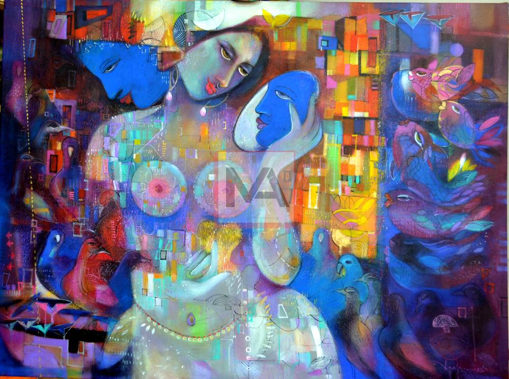 People of ancient India were well aquatinted with the real meaning of Shingar and it was the important element of love and beauty. It is ultimate Rasa and sublime emotion. Shingar is not decoration, it dwells in smile, appearance, gesture and attire. In Shingar the connoisseur is simply a visual delight. Madan in his painting the perfect Shingar which seems a spiritual experience in his visual. Beauty of the damsel follows all the ideals of Indian beauty. It is not just the love theme but a flash of divine romance which has no connection to mundane world. The coyness on the face of women cannot click till one reach to that level as it is the ocean of love. Her body is in rapturous ecstasy and dived in to water of desire. She is shown looking in to the mirror after Shingar but her heart reached to the divine figure who appeared in the mirror. Madan is the only artist who is able to show the power of intuition and imagination. Really surprising to see how the artist wove such delicate emotions and connections. Madan’s inner eye is very sharp which is the center of kundalini and difficult to awake but he did it through meditation. Look at the navel of the damsel which is deep on the slight belly. It is love gods snared the line going down from there only a rope to tie up the mind.In few words artist expresses that it was the time of flowering and the damsel flowering. He painted lotus flower in the background and the same grows into the image of the women. Trees and creeps in the background are blooming in love. His kohl on the space called out from mango leaves. Ducks too were frolicking among waves. Pigeons are also there as messengers. Sun light is dominating on the surface as the sun arise like the flame of passion. The God of love tries to hide in the shade of the ample breast which shows that the artist is well versed in the poetry of Kalidas. Damsels body looks cool but deep inside desires flame lead high which the artist shows through the tones of colors. This painting is like a piece of poetry altered into art. The image of young person contains indolence eyes who stands at the back of the damsel is the reflection of the same person to whom she saw in the mirror. She speaks’’ I saw him, my love his body was a blue cloud.’’ This work is true expression of beauty when soul says ‘’ He is without a beginning, has no shape, no end and never has been born on this earth, to relieve her suffering.” Fishes are conveying the content of the painting. They can not live without the ocean [nectar].