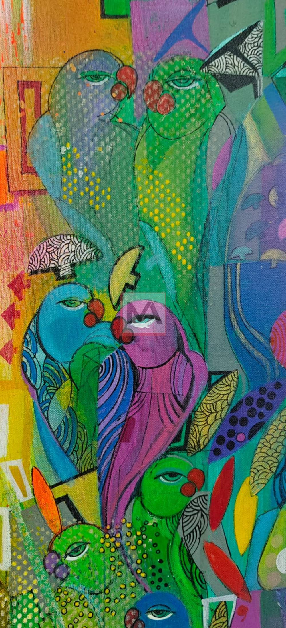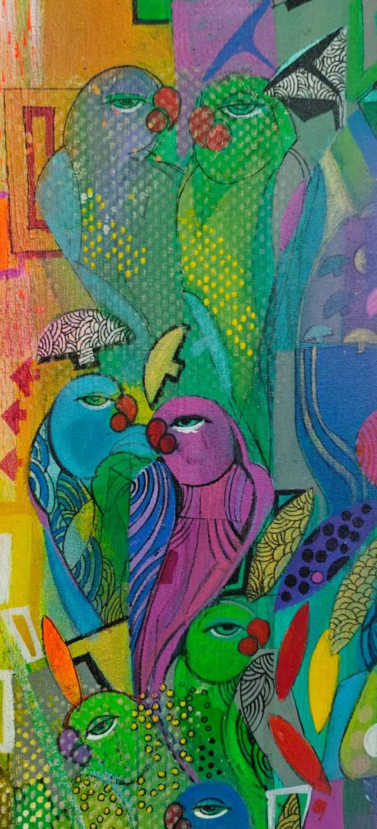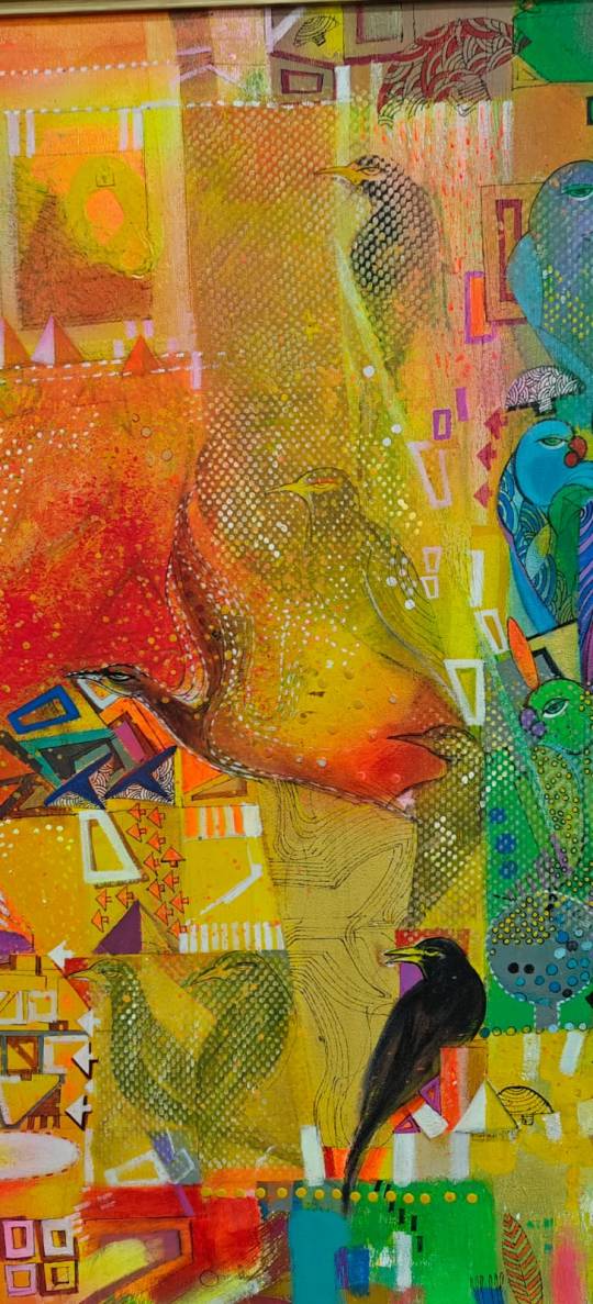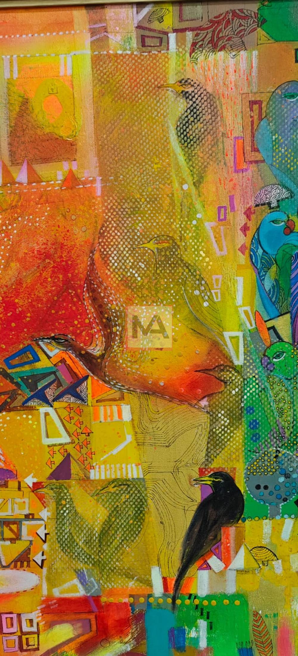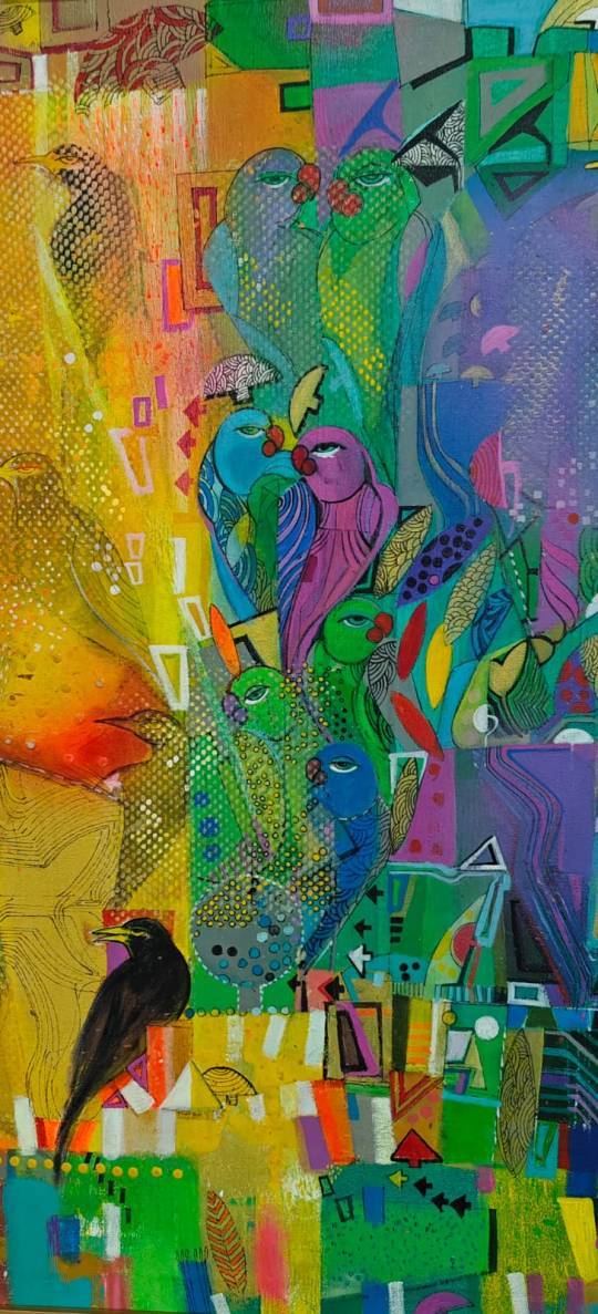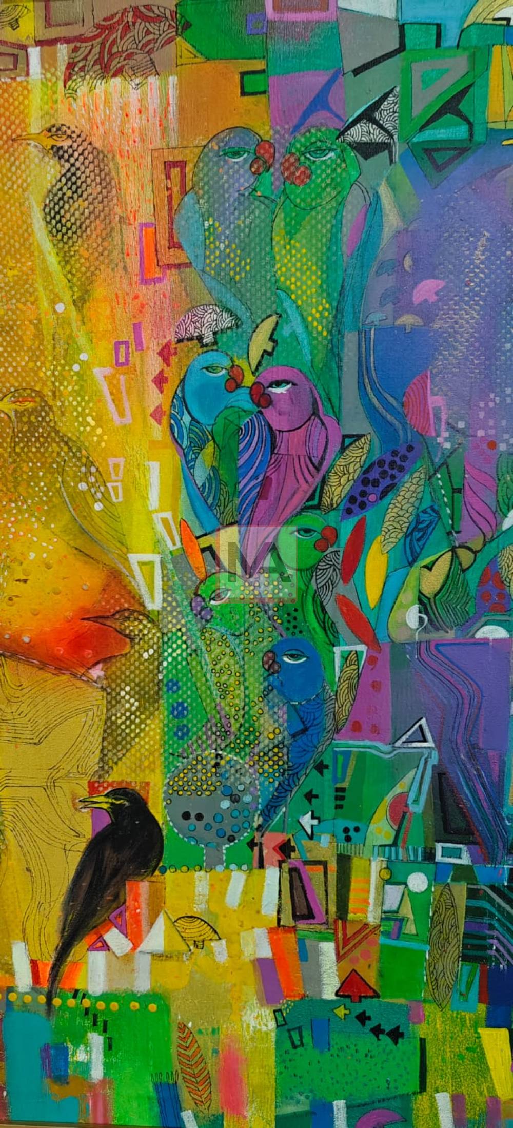 Madan is versatile genius artist who understand the meaning of perfection. His content represents that he is well versed in the theory of Natya sastra, treatise on dramatic art written by Brahman sage and priest Bharata. He painted cuckoo Who is alert and fully conscious what ever is happening around. She is fond of singing always sits on the mango trees. Tempting mango trees in spring trees which are related to romance. But in this work the cuckoo is perturbed and welling up in her mind. Parrots near by too are melodious and discussing about the self preservation. I feel these parrots suggest the koel ‘’A beautiful art is always a meeting ground of the sublime and the particular—the ideal and the sensuous.’’ So parrots are sensuous as blessed by Kama but koel is black. She is gifted with beautiful sound to express the relation to God.Madan is a thinker and understands the condition of the koel when she flies in the sky after measuring the storm of various colors perhaps remembering the lines of Rabindranath - ‘’There is no mere play This is the intense pain When my heart burns.’’ Madan is like the adept gardner who know how to sow seeds of fragrance in life. Looking on the canvas one start listening the symphonies of music which become one with the musical voice of koel.