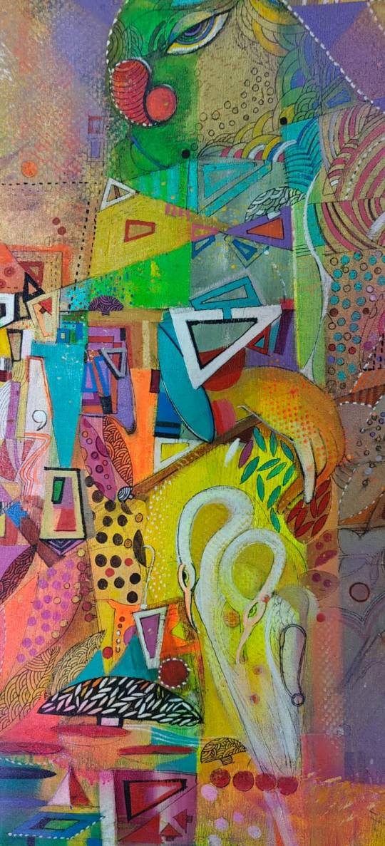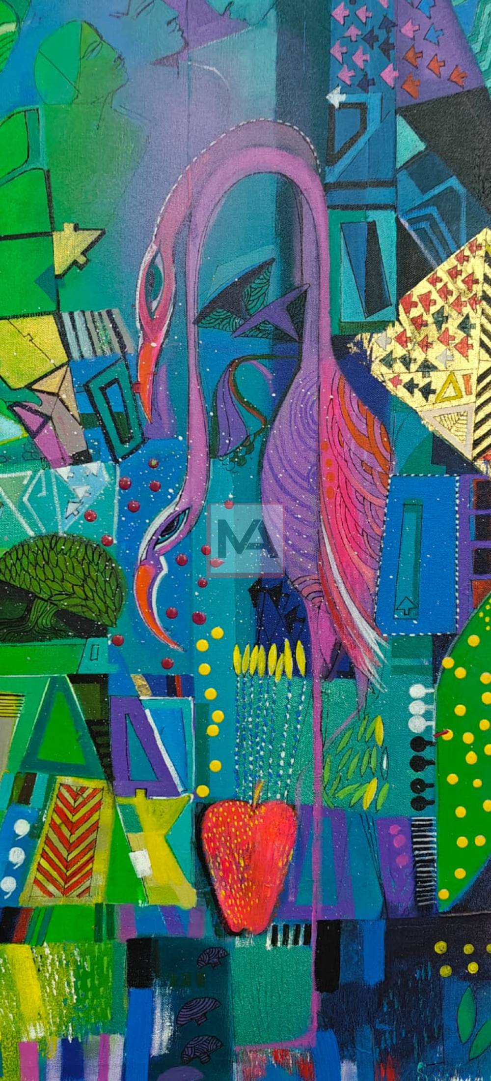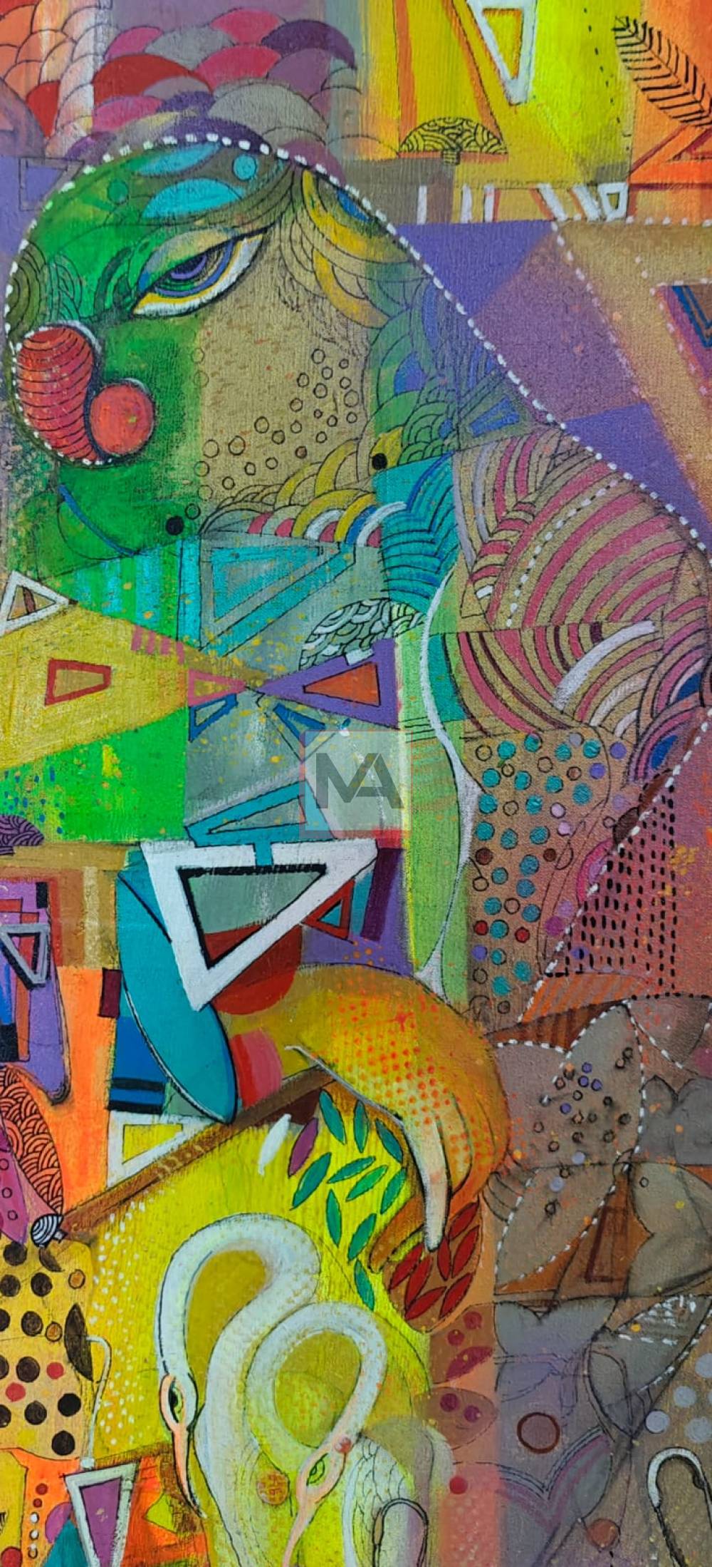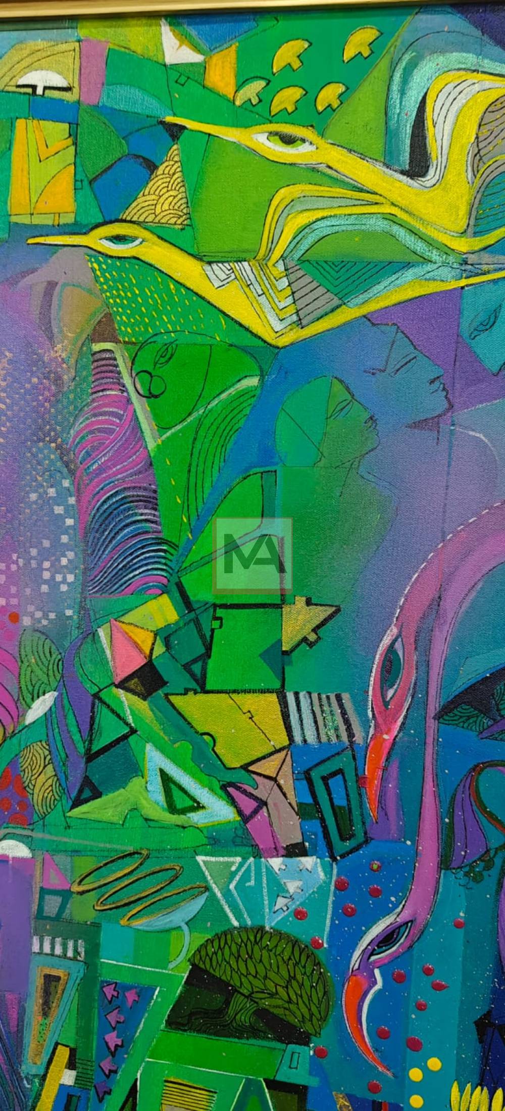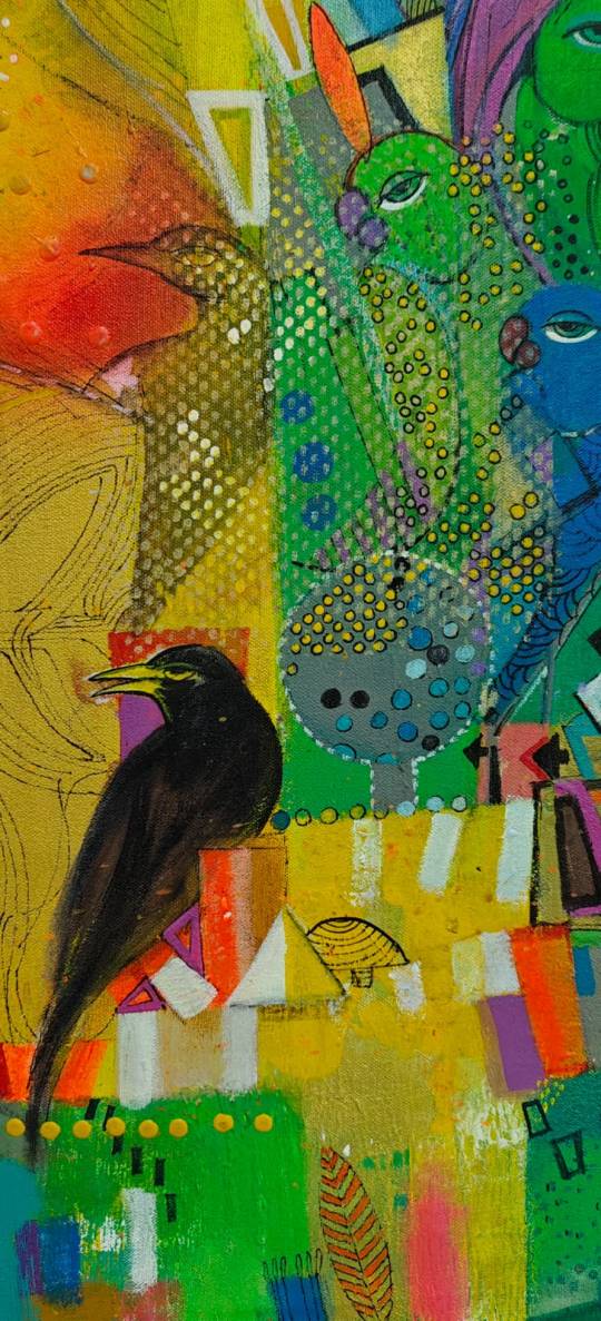Madan is versatile genius artist who understand the meaning of perfection. His content represents that he is well versed in the theory of Natya sastra, treatise on dramatic art written by Brahman sage and priest Bharata. He painted cuckoo Who is alert and fully conscious what ever is happening around. She is fond of singing always sits on the mango trees. Tempting mango trees in spring trees which are related to romance. But in this work the cuckoo is perturbed and welling up in her mind. Parrots near by too are melodious and discussing about the self preservation. I feel these parrots suggest the koel ‘’A beautiful art is always a meeting ground of the sublime and the particular—the ideal and the sensuous.’’ So parrots are sensuous as blessed by Kama but koel is black. She is gifted with beautiful sound to express the relation to God.Madan is a thinker and understands the condition of the koel when she flies in the sky after measuring the storm of various colors perhaps remembering the lines of Rabindranath - ‘’There is no mere play This is the intense pain When my heart burns.’’ Madan is like the adept gardner who know how to sow seeds of fragrance in life. Looking on the canvas one start listening the symphonies of music which become one with the musical voice of koel.