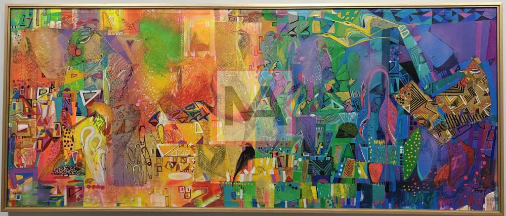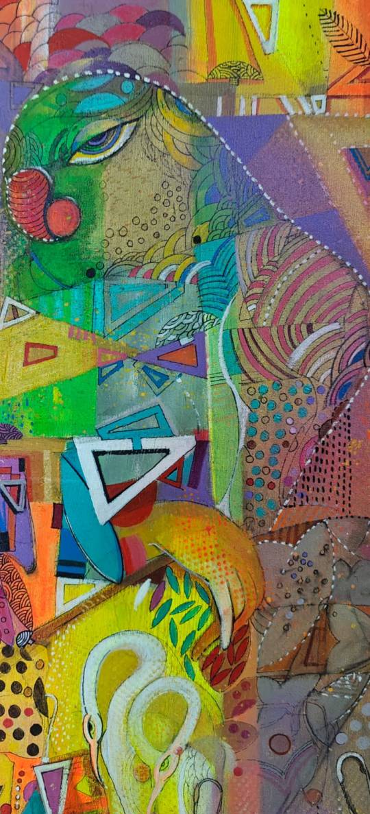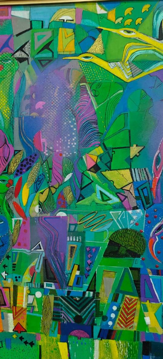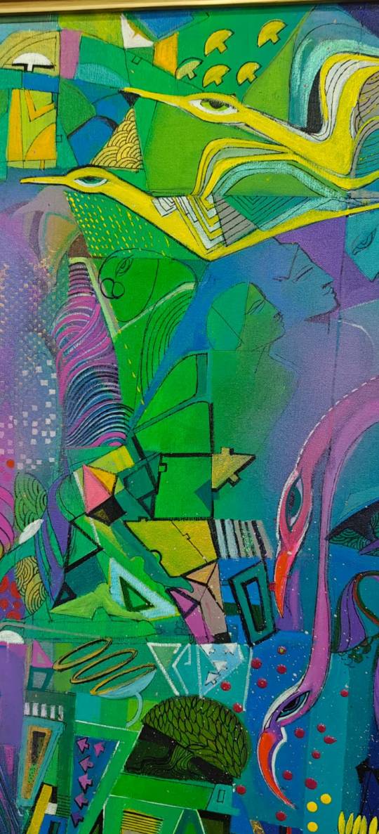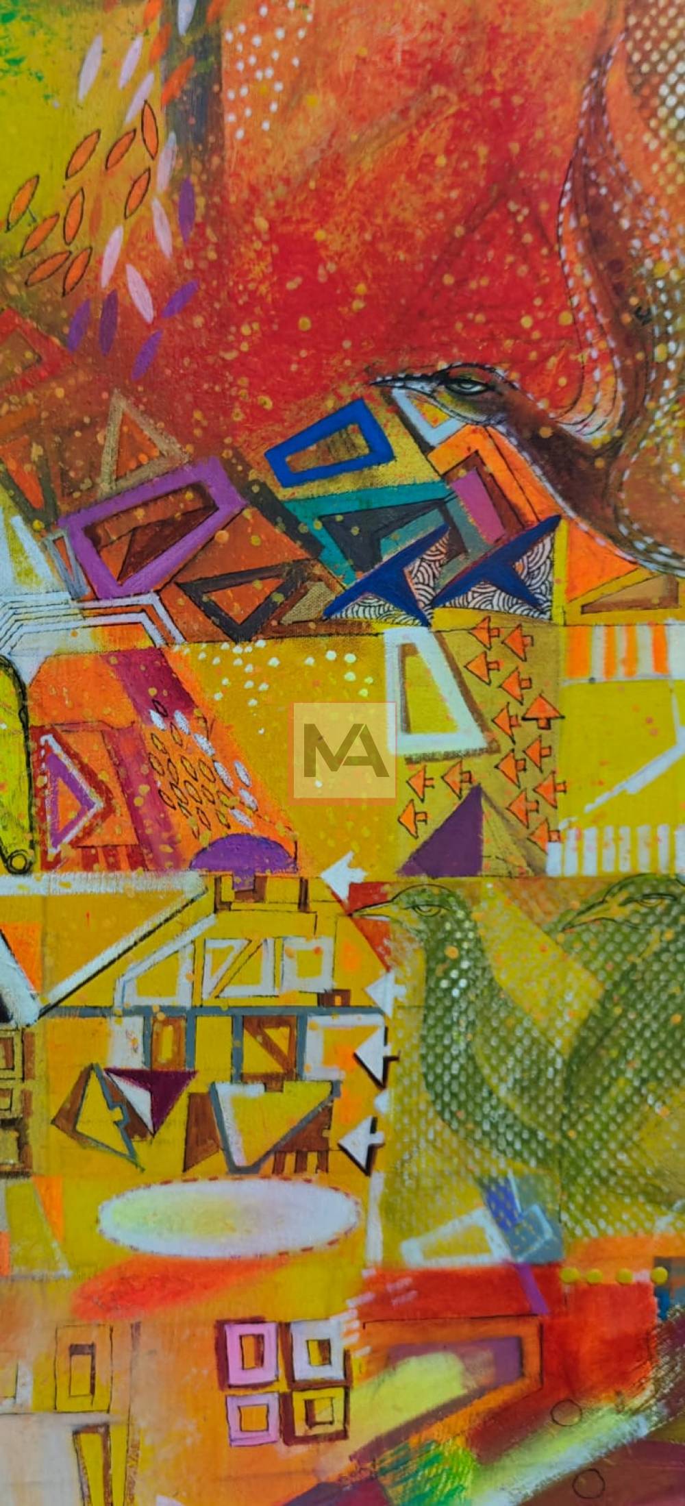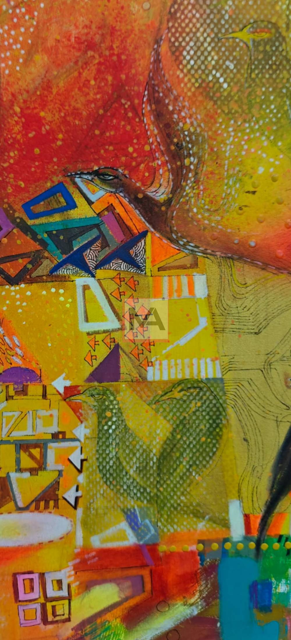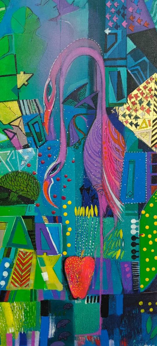 Madan is versatile genius artist who understand the meaning of perfection. His content represents that he is well versed in the theory of Natya sastra, treatise on dramatic art written by Brahman sage and priest Bharata. He painted cuckoo Who is alert and fully conscious what ever is happening around. She is fond of singing always sits on the mango trees. Tempting mango trees in spring trees which are related to romance. But in this work the cuckoo is perturbed and welling up in her mind. Parrots near by too are melodious and discussing about the self preservation. I feel these parrots suggest the koel ‘’A beautiful art is always a meeting ground of the sublime and the particular—the ideal and the sensuous.’’ So parrots are sensuous as blessed by Kama but koel is black. She is gifted with beautiful sound to express the relation to God.Madan is a thinker and understands the condition of the koel when she flies in the sky after measuring the storm of various colors perhaps remembering the lines of Rabindranath - ‘’There is no mere play This is the intense pain When my heart burns.’’ Madan is like the adept gardner who know how to sow seeds of fragrance in life. Looking on the canvas one start listening the symphonies of music which become one with the musical voice of koel.
