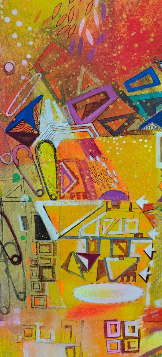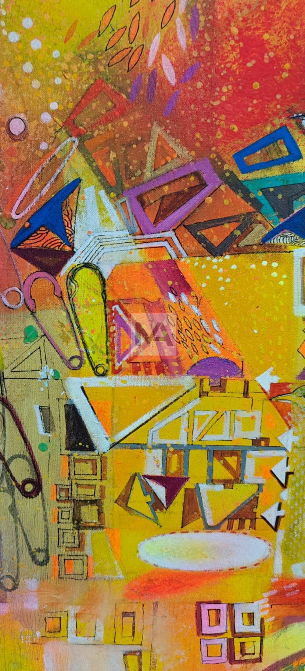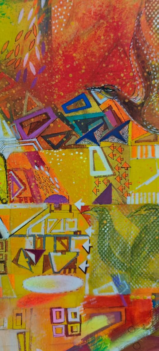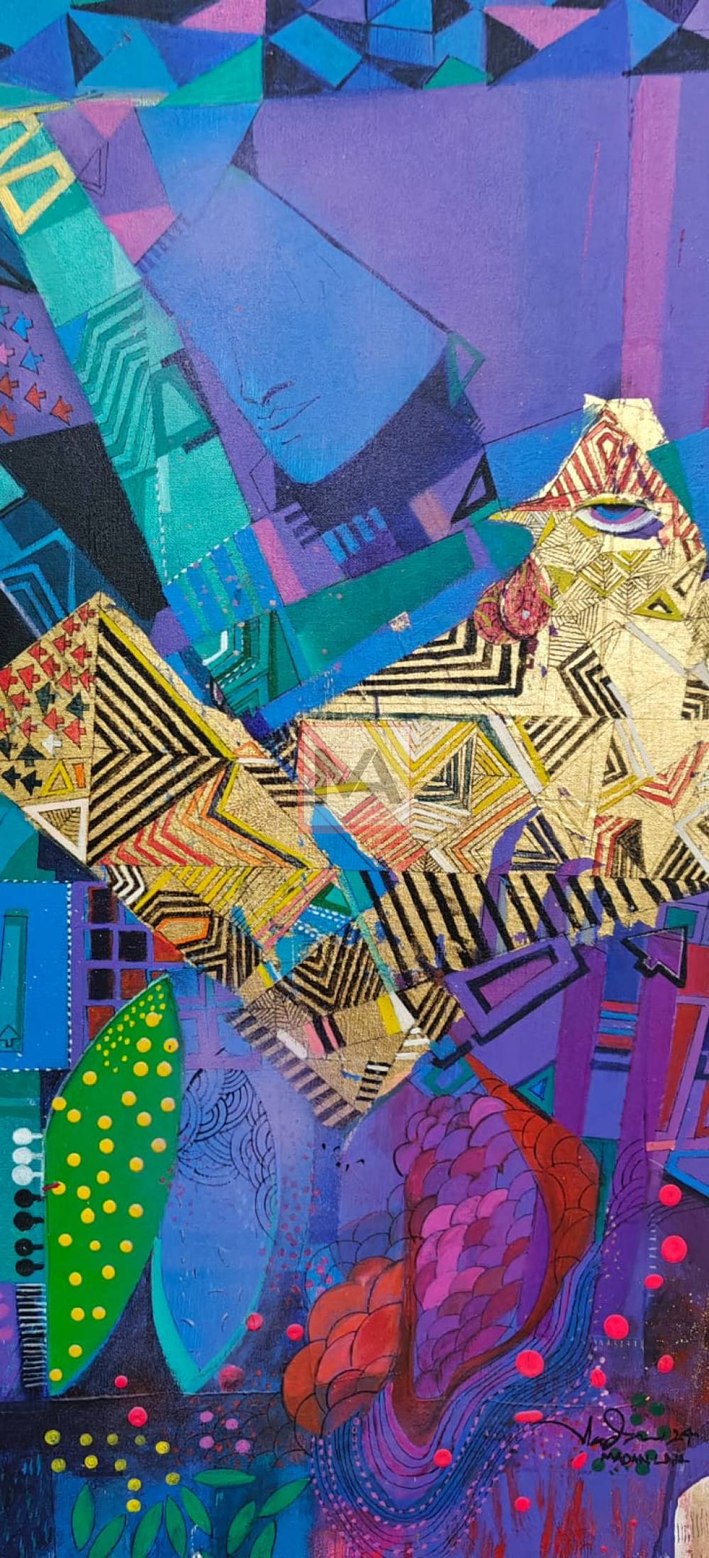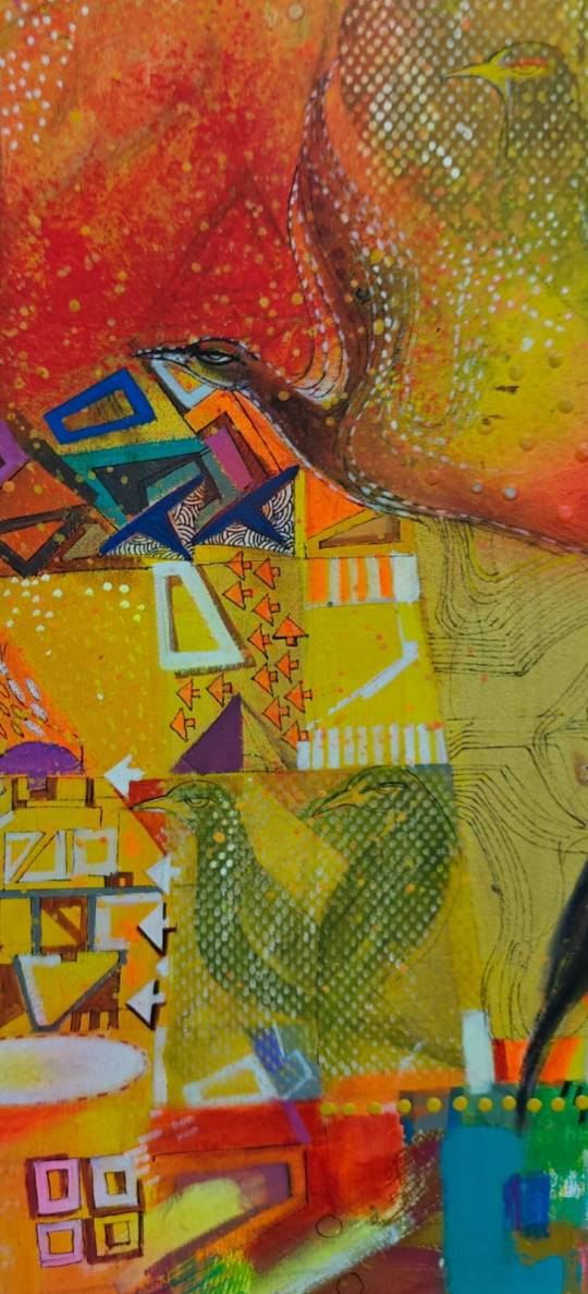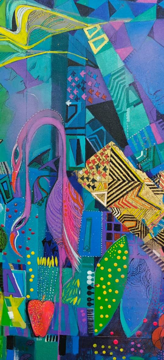 Madan is versatile genius artist who understand the meaning of perfection. His content represents that he is well versed in the theory of Natya sastra, treatise on dramatic art written by Brahman sage and priest Bharata. He painted cuckoo Who is alert and fully conscious what ever is happening around. She is fond of singing always sits on the mango trees. Tempting mango trees in spring trees which are related to romance. But in this work the cuckoo is perturbed and welling up in her mind. Parrots near by too are melodious and discussing about the self preservation. I feel these parrots suggest the koel ‘’A beautiful art is always a meeting ground of the sublime and the particular—the ideal and the sensuous.’’ So parrots are sensuous as blessed by Kama but koel is black. She is gifted with beautiful sound to express the relation to God.Madan is a thinker and understands the condition of the koel when she flies in the sky after measuring the storm of various colors perhaps remembering the lines of Rabindranath - ‘’There is no mere play This is the intense pain When my heart burns.’’ Madan is like the adept gardner who know how to sow seeds of fragrance in life. Looking on the canvas one start listening the symphonies of music which become one with the musical voice of koel.