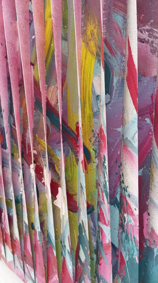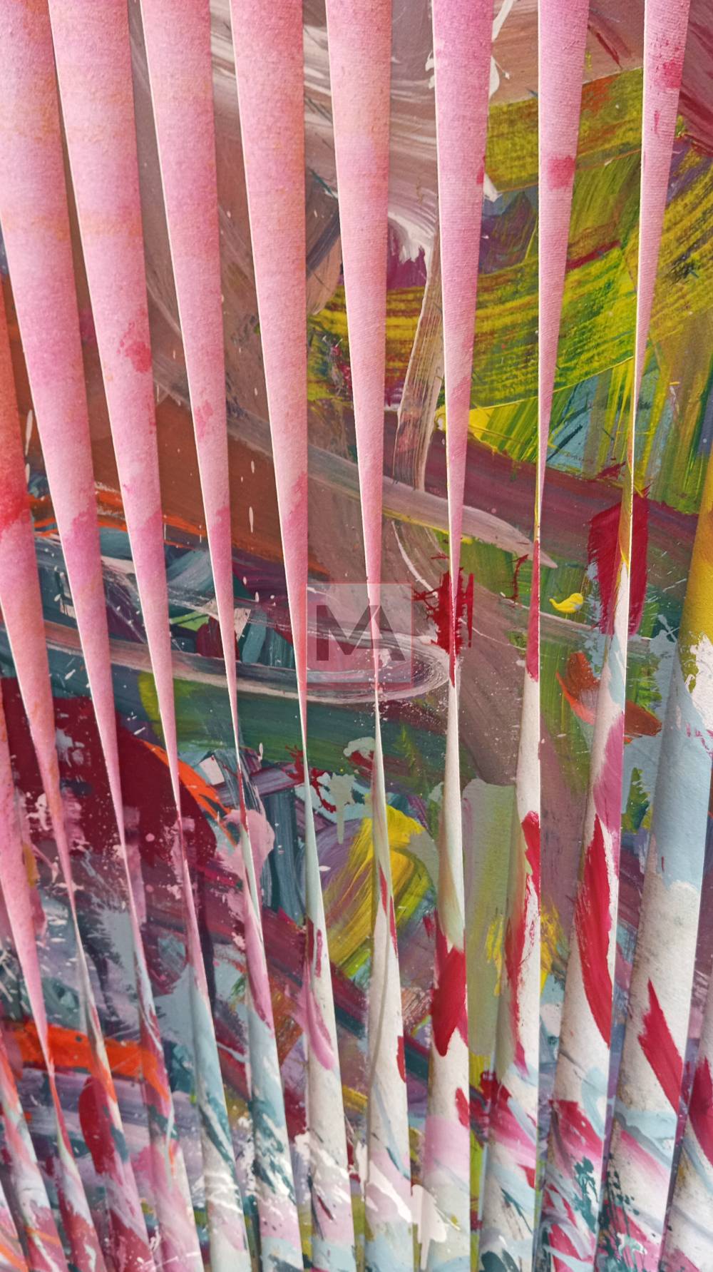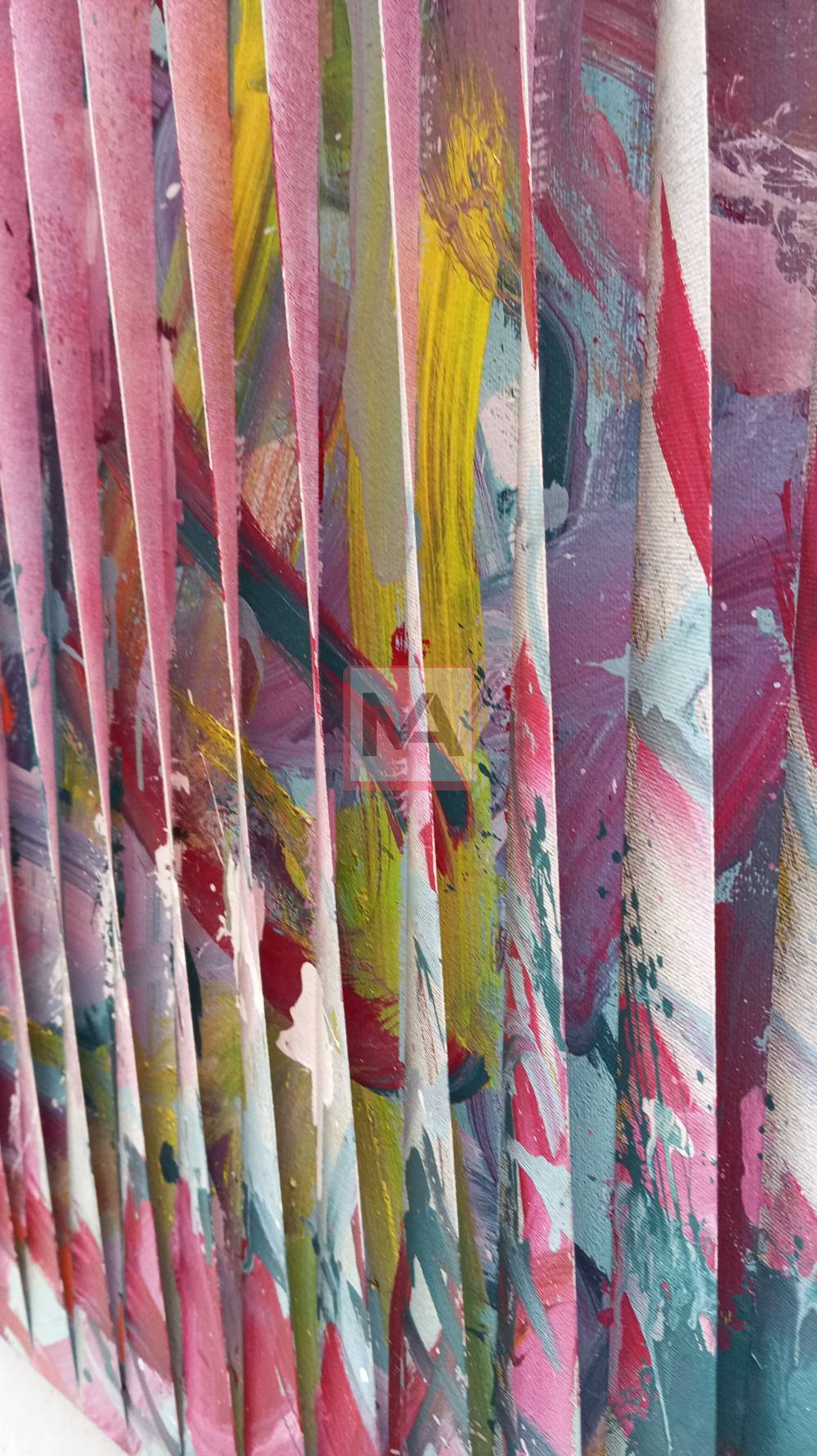 This work reflects a cycle of transformation—being changed, shaped by external forces, and ultimately becoming the one who creates change. Vertical cuts suggest both boundaries and openings, while layered colors capture an ongoing, evolving process of growth and renewal.